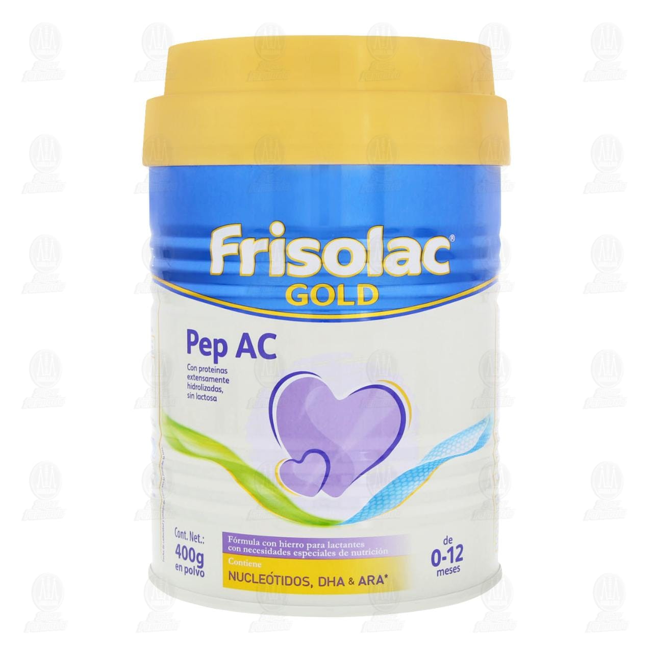 Fórmula infantil Frisolac Gold Pep AC, indicada para lactantes de 0 a 12 meses con necesidades especiales de nutrición. Alimento en polvo adicionado con hierro y proteínas extensamente hidrolizadas. Lata con 400 gramos.