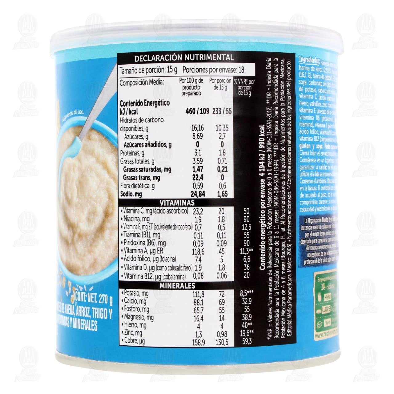 La organización mundial de la salud recomienda lactancia materna exclusiva por 6 meses y continuarla por el mayor tiempo posible. Este producto está diseñado para consumirse como parte de sus primeros alimentos complementarios, pero dado que las necesidades de los bebés varían, consulta al profesional de la salud sobre cuando introducirlo. Contiene gluten y soya. Puede contener leche. Cierre bien el envase después de cada uso. Consérvese en un lugar fresco y seco. Para garantizar la calidad de este producto, no utilizar si la lata se encuentra dañada o golpeada.Detalles del producto