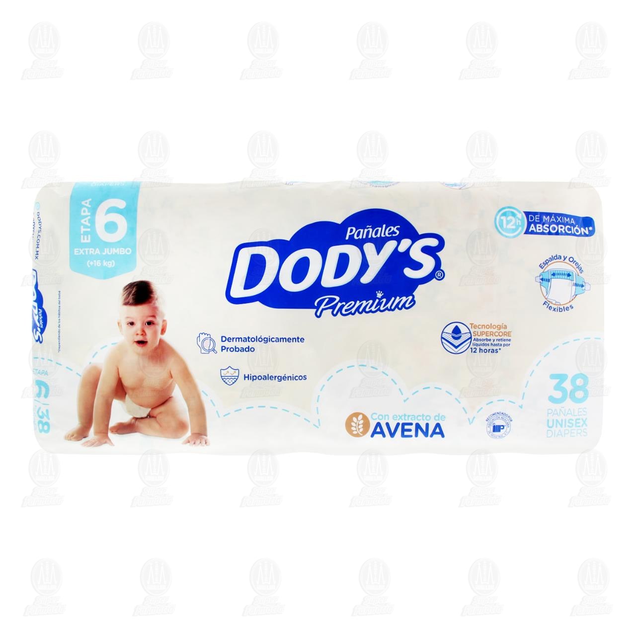 Pañal Desechable para Bebé Dody´s Premium con Extracto de avena que regenera y protege la piel, hasta 12 horas de Máxima absorción, etapa 6, Extra jumbo (16 kg). Paquete con 38 piezas.