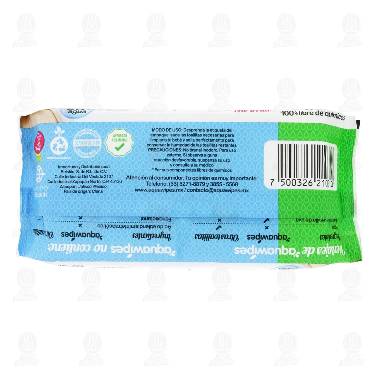Toallitas húmedas para bebé Aquawipes Premium, 100% naturales y libres de químicos, con extracto de pepino, granada, manzanilla y uva, humectan y refrescan la piel de tu bebé de forma natural. Paquete con 50 piezas.
