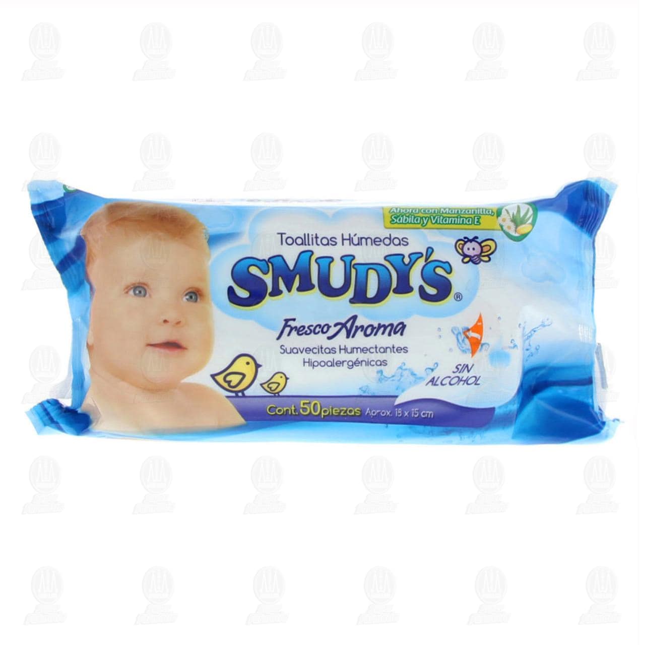 Toallitas húmedas para bebé Smudy's Fresco Aroma, hipoalergénicas, sin alcohol, ahora con manzanilla, sábila y vitamina E. Paquete con 50 piezas.