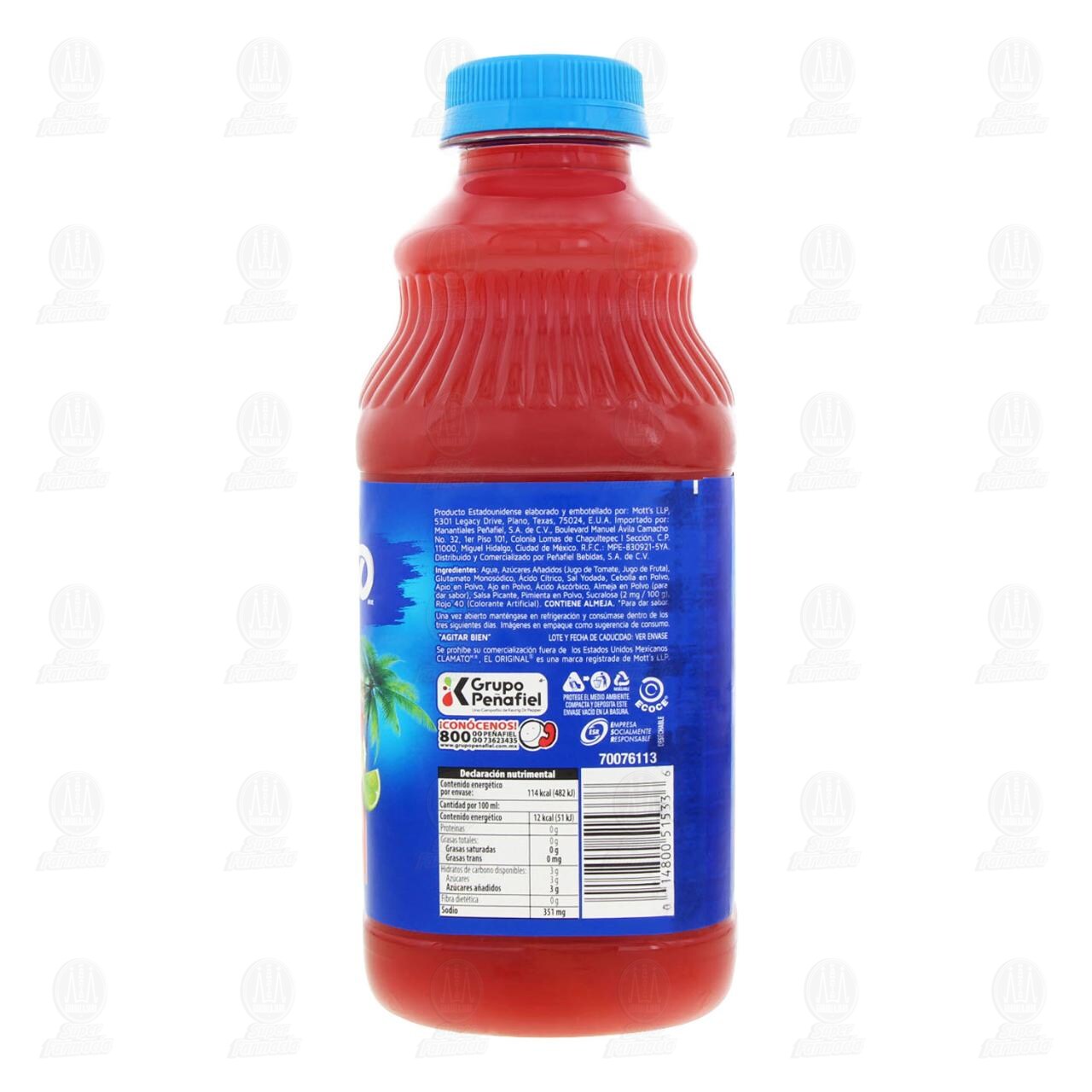 Bebida de jugo de tomate Clamato El Original, con un toque de almeja. Botella con 946 mililitros.