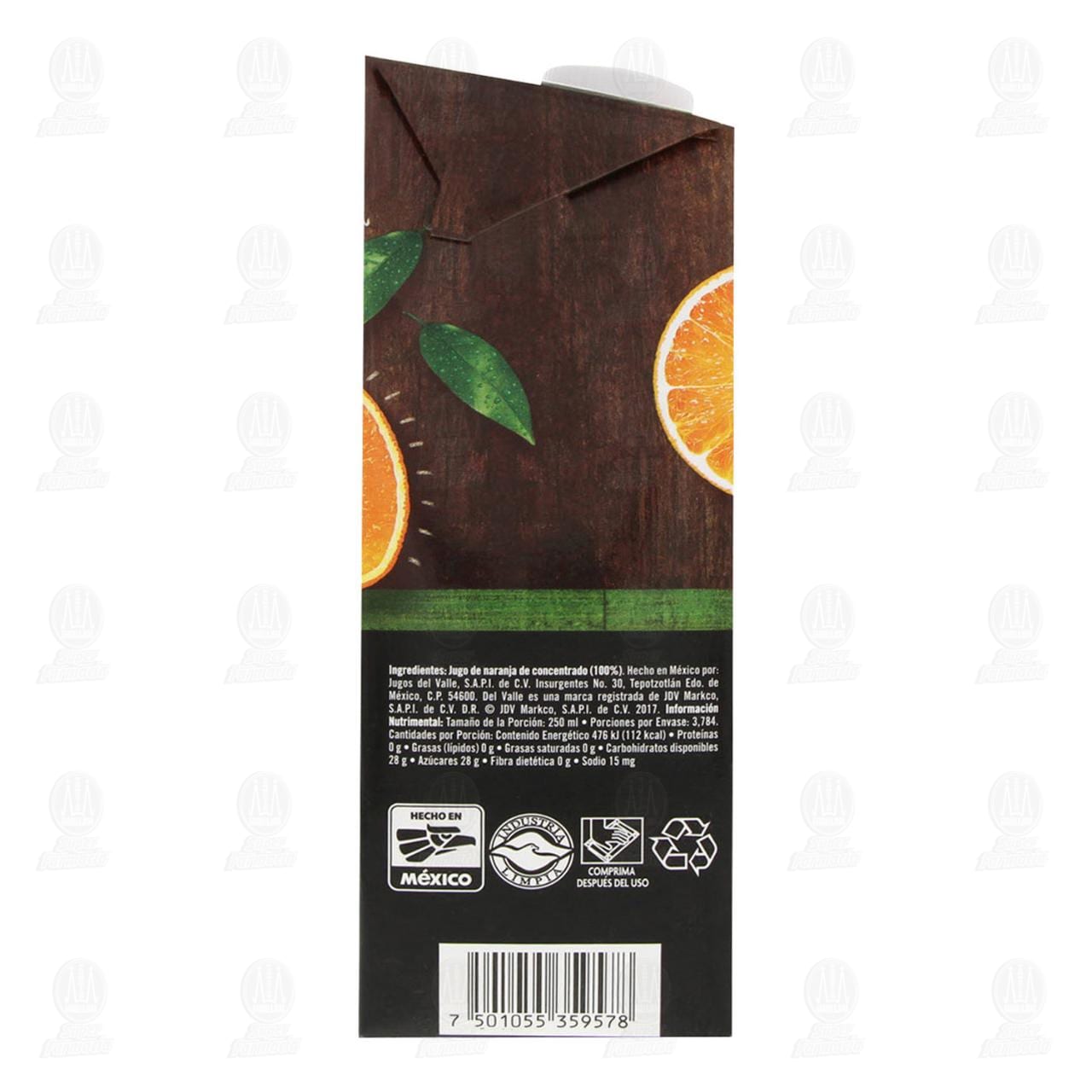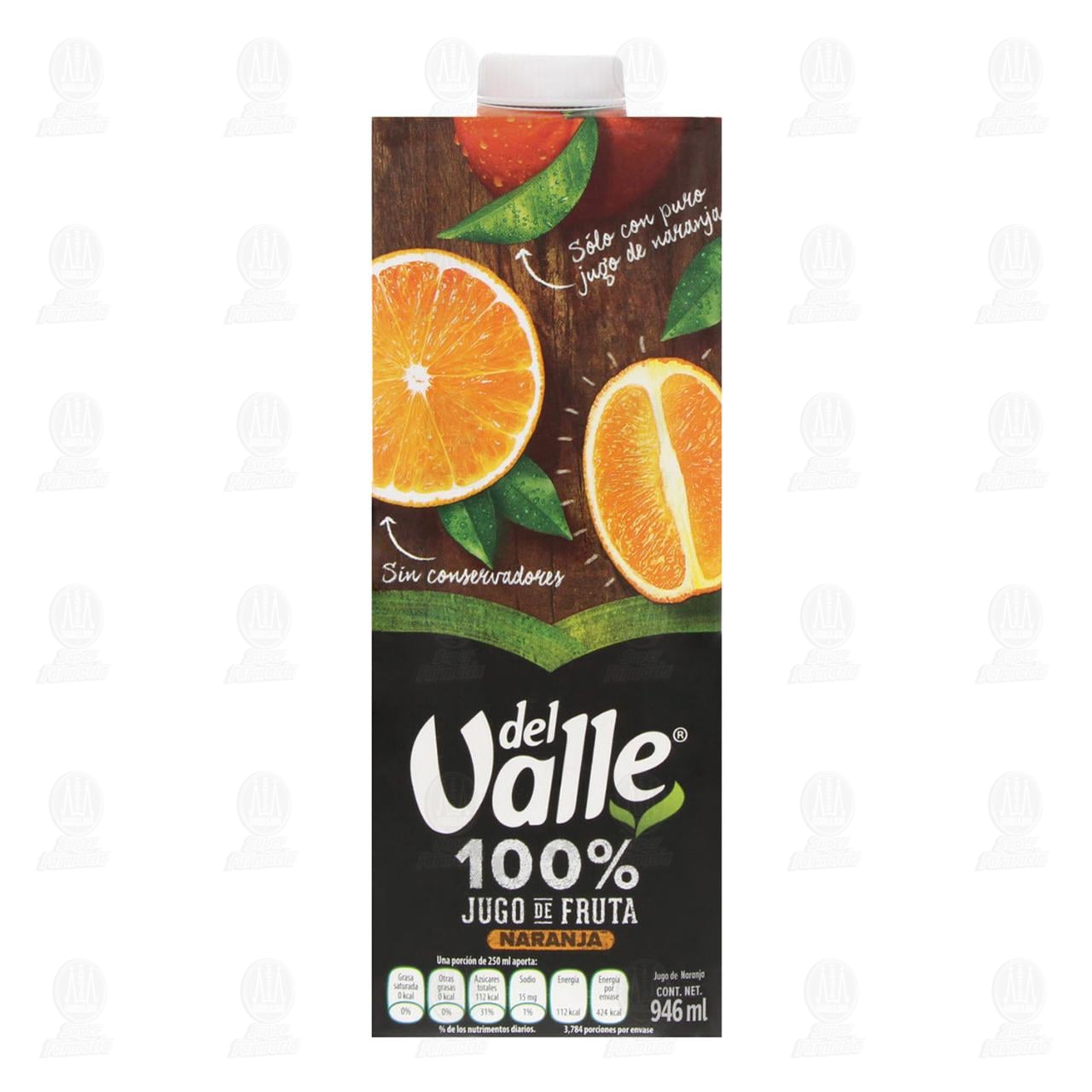Jugo del Valle 100% de fruta, sólo con puro jugo de naranja. Envase de 946 mililitros.