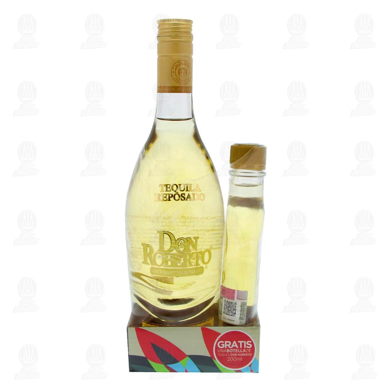 Tequila reposado Don Roberto Antiguo Tequilero, 100% de agave. Contiene 1 botella con 700 mililitros y 1 botella de 200 mililitros de regalo con 35% volumen de alcohol por cada botella.
