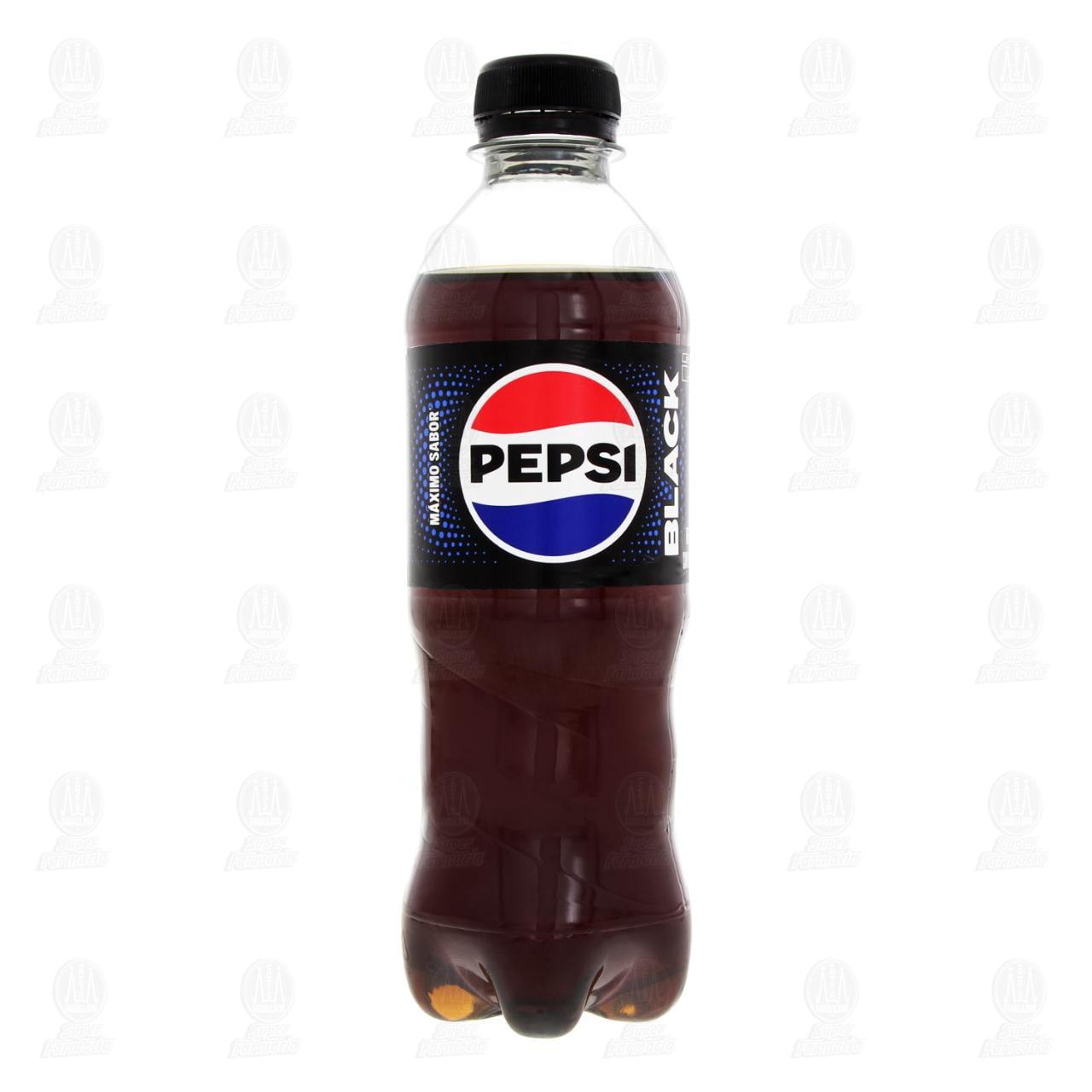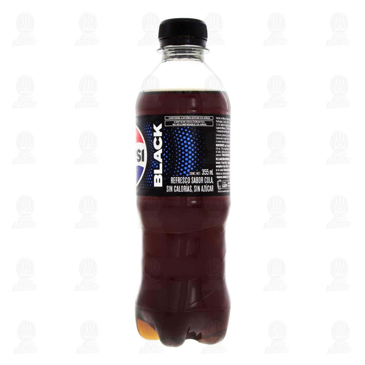 Refresco Pepsi Black, sabor cola, sin azúcar ni calorías. Botella con 355 mililitros.