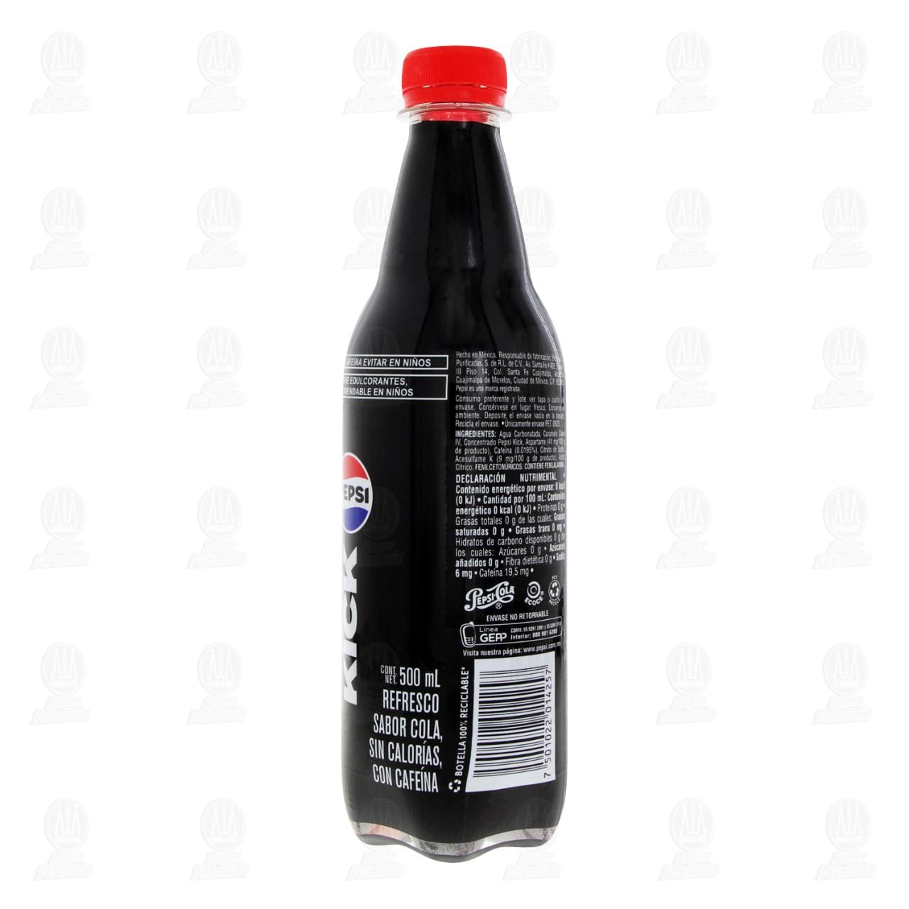 Refresco Pepsi Kick con un Toque de Cafeína, Sabor Cola. Botella con 500 mililitros.