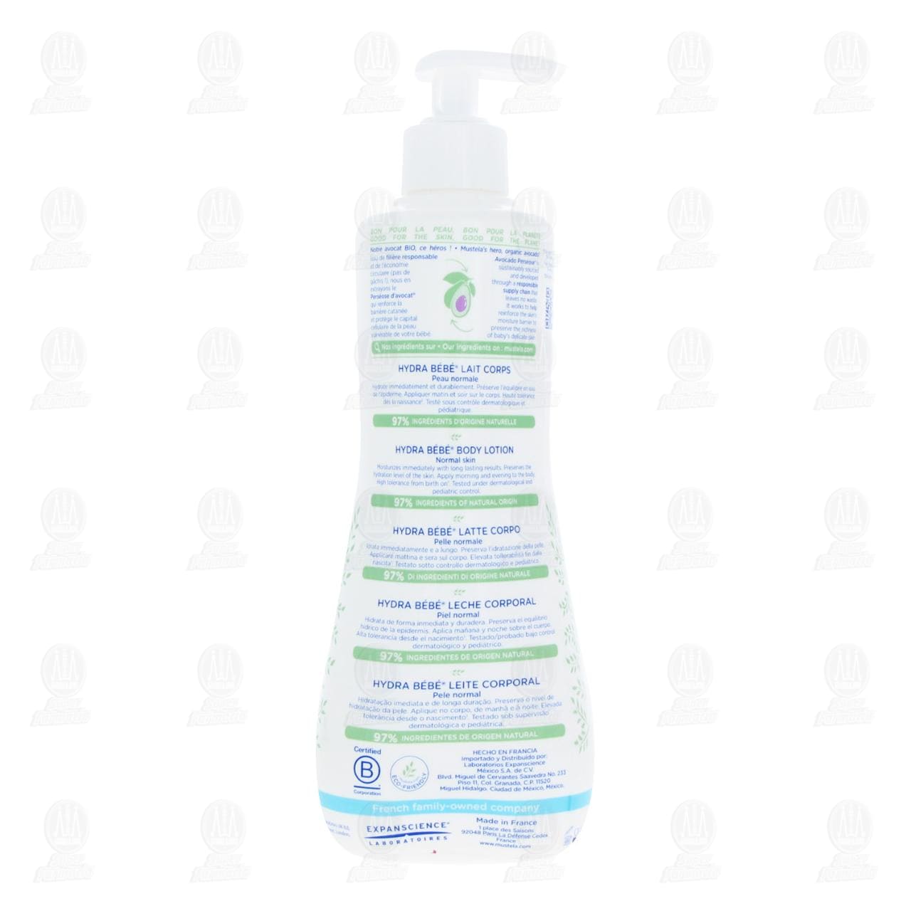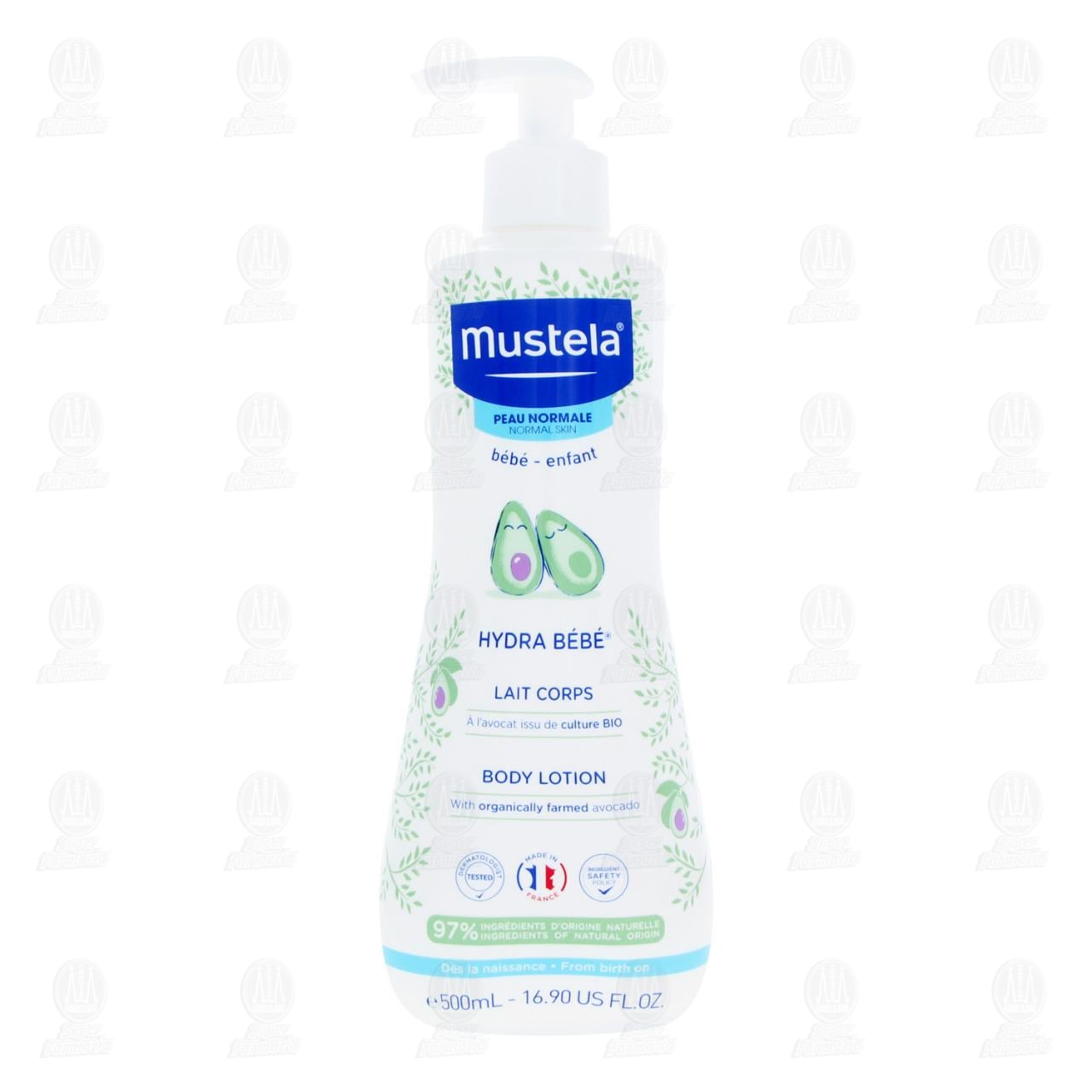 Loción Corporal Mustela Hydra Bébé para Piel Normal, hidrata de forma inmediata y duradera, con 97% de ingredientes de origen natural. Contiene 500 mililitros.