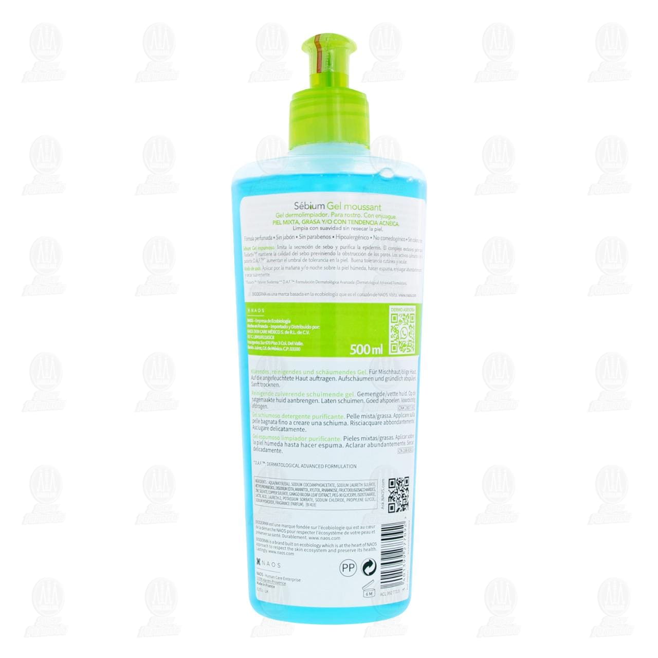 Gel Dermolimpiador Bioderma Sébium Gel Moussant para piel mixta, grasa y/o con tendencia acneica, limpia la secreción de sebo y purifica la epidermis. Limpia y purifica suavemente. Envase con 500 mililitros.