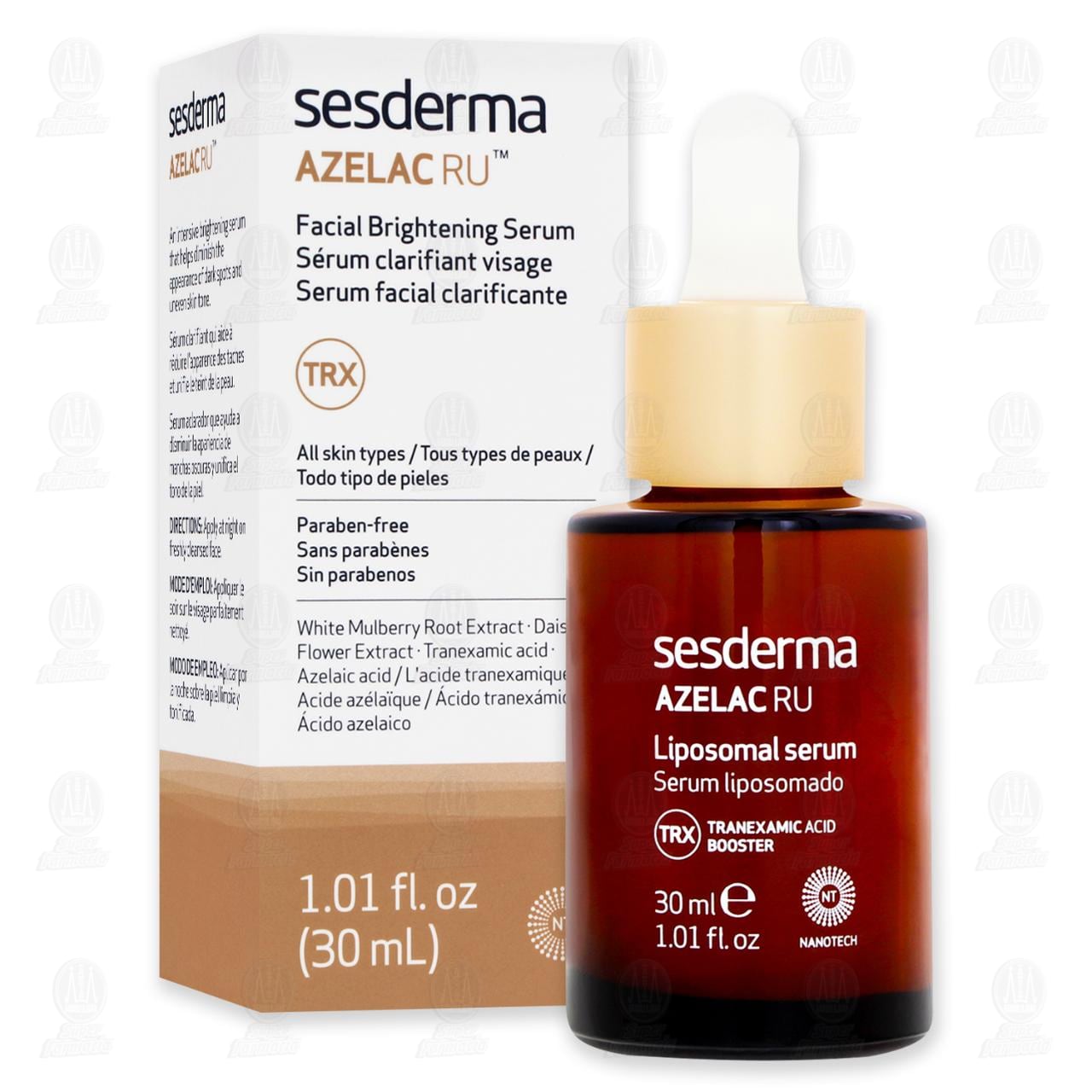 Serum Facial Sesderma Azelac Ru Clarificante Trx para todo tipo de pieles, Ayuda a disminuir la apariencia de manchas oscuras y unifica el tono de piel. Contiene 30 mililitros.