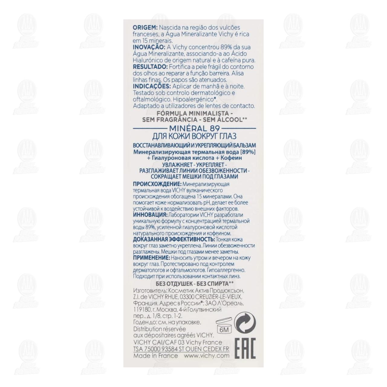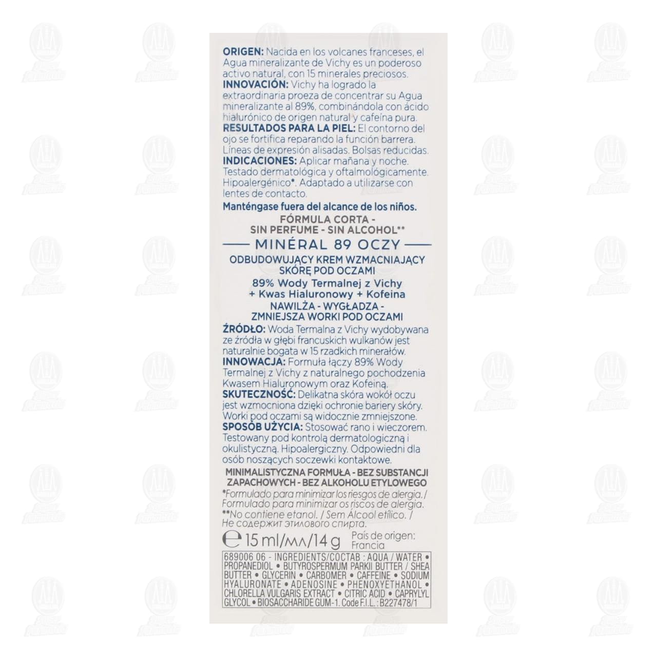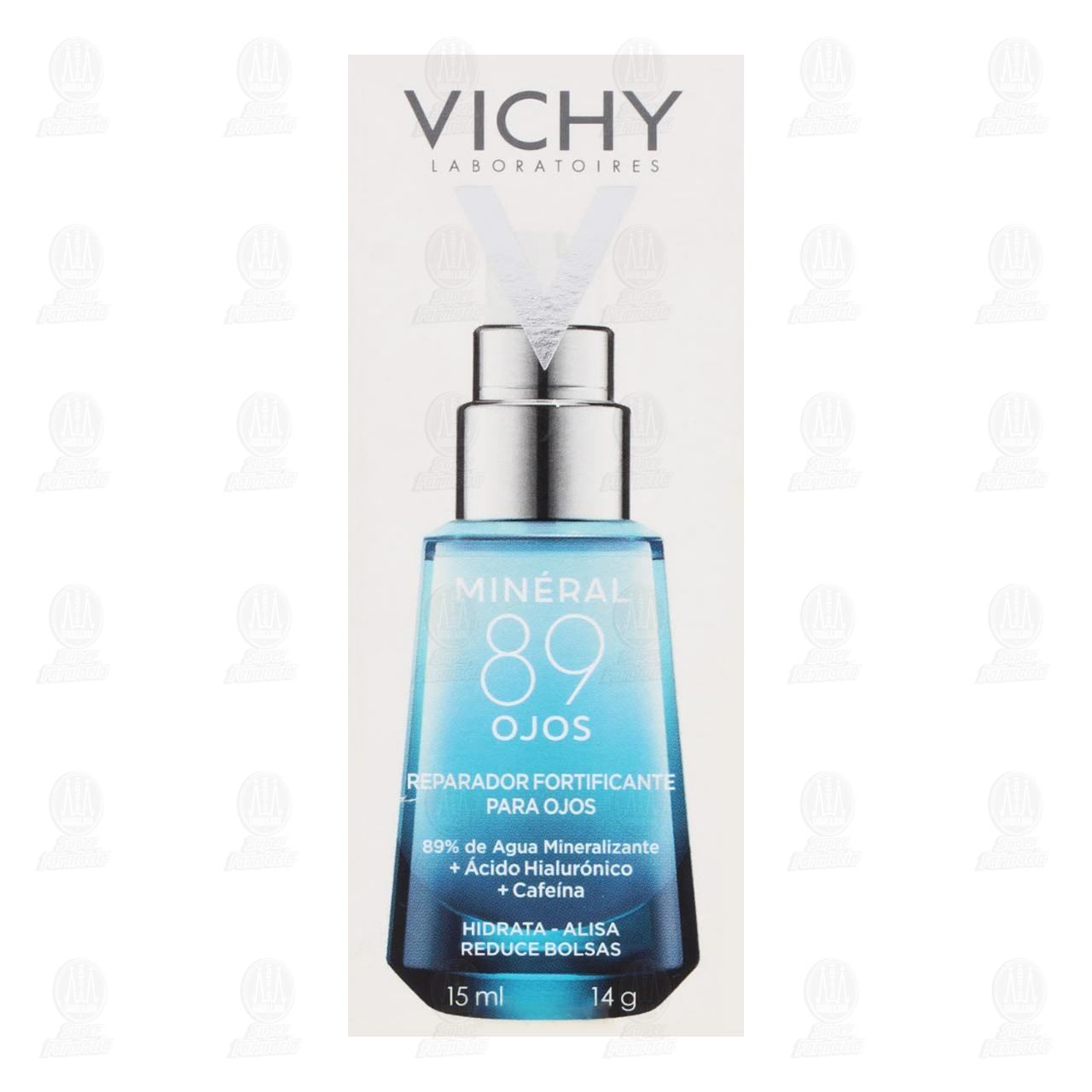 Vichy Reparador Fortificante para Ojos Mineral 89 Hidrata Alisa y Reduce Bolsas. Contiene 15 mililitros.