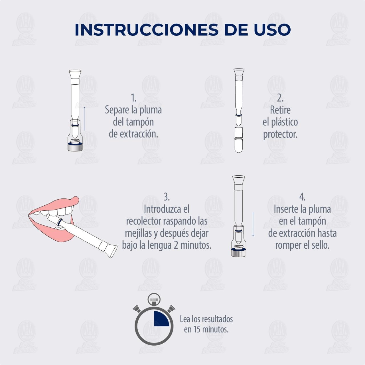 1. Lave y desinfecte sus manos antes de utilizar la prueba. 2. Retire la prueba de su empaque. 3. Introduzca el dispositivo al fondo de su boca por 2 minutos. 4. Inserte la pluma en el tampón de extracción. Lea los resultados en 15 minutos.Detalles del producto