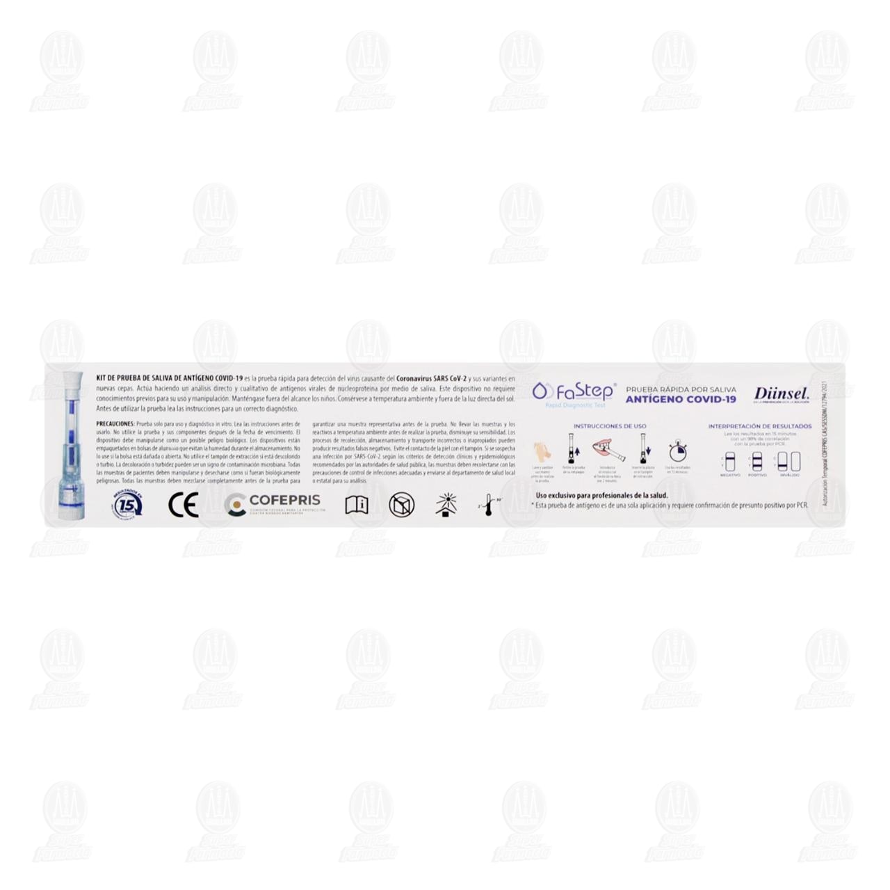 Prueba rápida FaStep Antígeno por saliva, para detección del virus causante del SARS CoV-2 y sus variantes en nuevas cepas. Contiene 1 pieza.