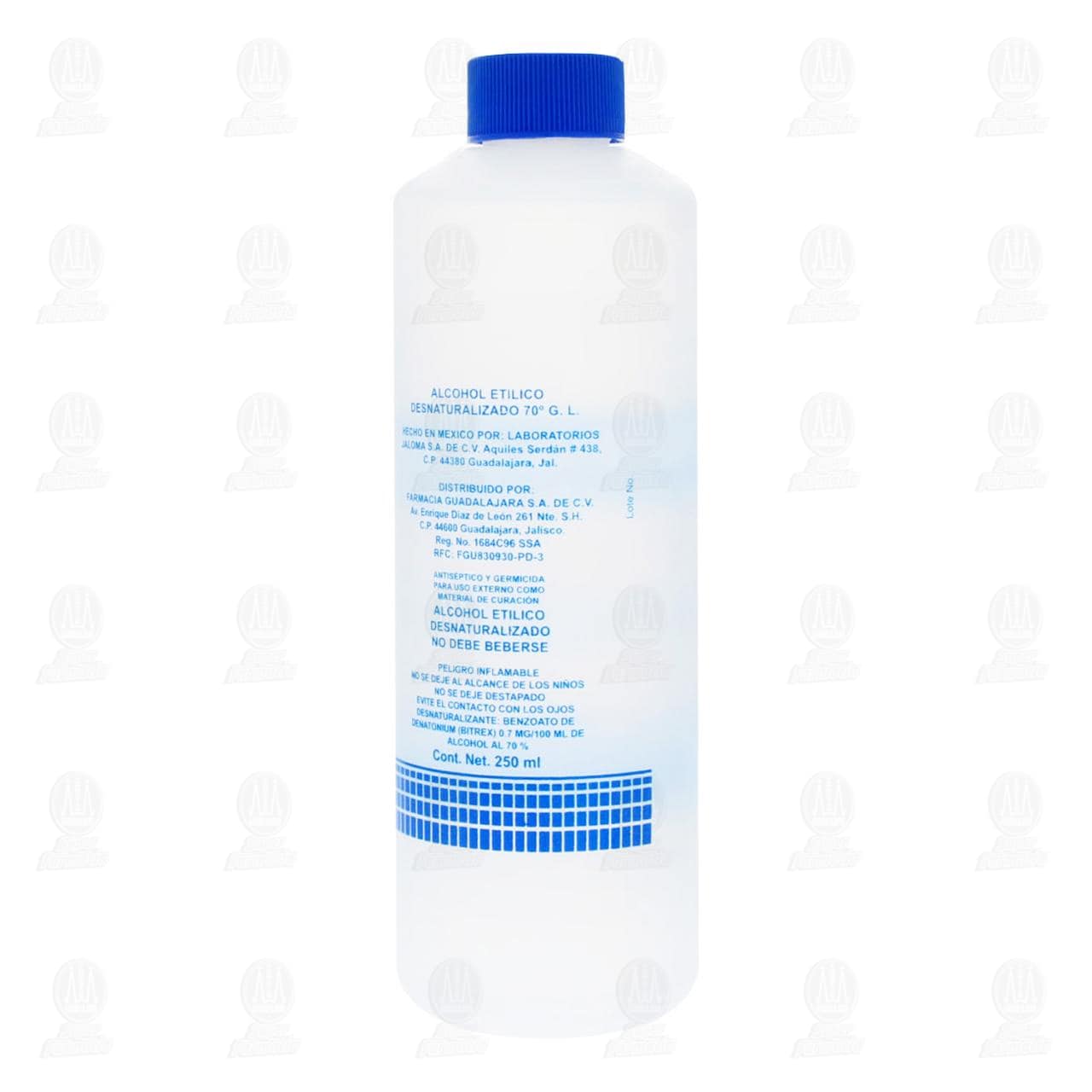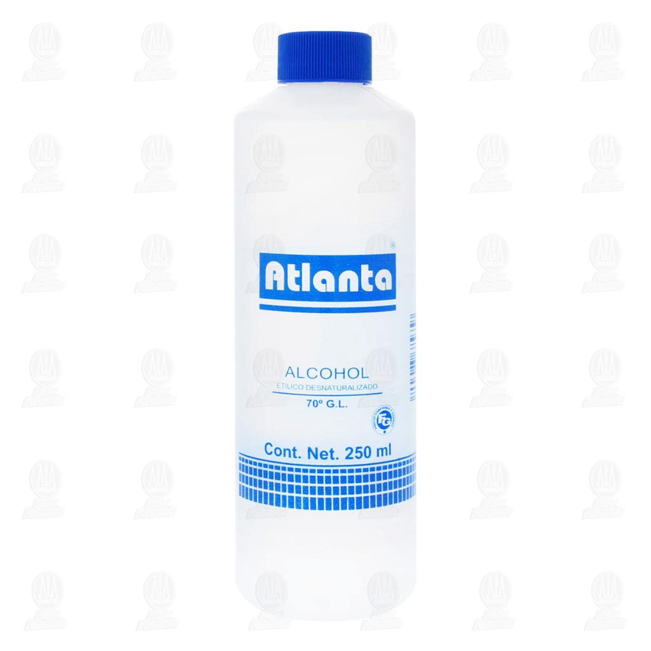 Alcohol Atlanta Etílico 70° Azul. Envase con 250 mililitros.
