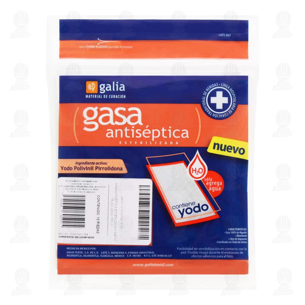Gasa absorbente antiséptica Galia, desechable, tamaño (10 cm x 10 cm), con ingrediente activo de yodo polivinil pirrolidona, esterilizada con óxido de etileno. Contiene 10 sobres.