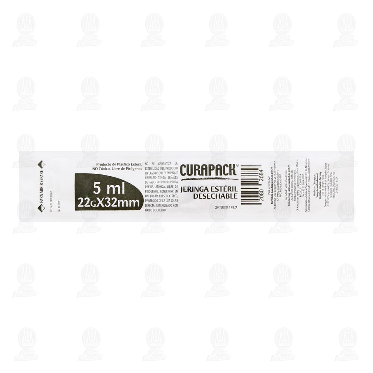 Jeringa Estéril de Plástico Curapack, Desechable, con Aguja (22G x 32mm) y Capacidad de 5 mililitros. Contiene 1 pieza.