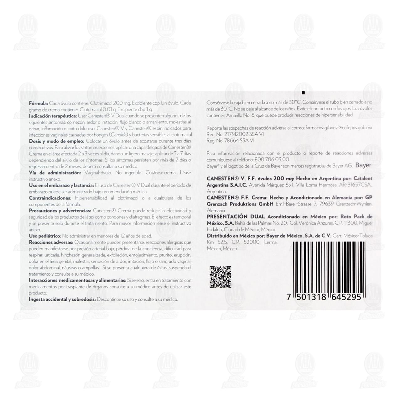 Dosis y modo de empleo: Colocar un óvulo antes de acostarse durante tres días consecutivos. Para aliviar los síntomas externos, aplicar una capa delgada de Canesten crema en el área afectada 2 a 3 veces al día, dando un ligero masaje, aplicar de 3 a 7 días dependiendo del alivio de los síntomas. Vía de administración: Vaginal-óvulo. No ingerir. Cutánea-crema. Léase instructivo anexo.Detalles del producto
