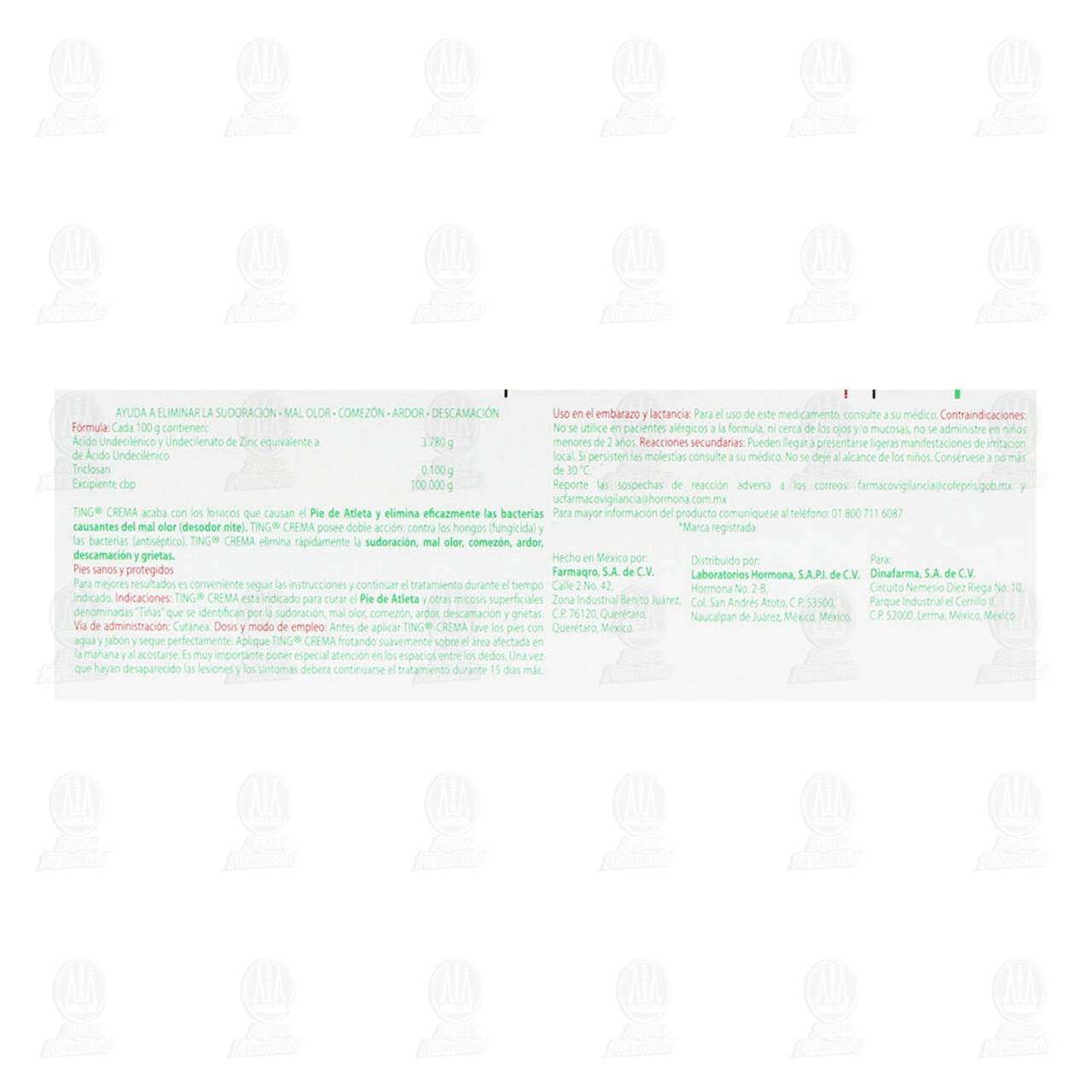 Indicaciones: Ting crema está indicado para curar el pie de atleta y otras micosis superficiales denominadas "tiñas" que se identifican por la sudoración, mal olor, comezón, ardor, descamación y grietas. Vía de administración: cutánea. Dosis y modo de empleo: antes de aplicar Ting crema lave los pies con agua y jabón y seque perfectamente. Aplique Ting crema frotando suavemente sobre el área afectada en la mañana y al acostarse. Es muy importante poner especial atención en los espacios entre los dedos. Una vez que hayan desaparecido las lesiones y los síntomas deberá continuarse el tratamiento durante 15 días más.Detalles del producto