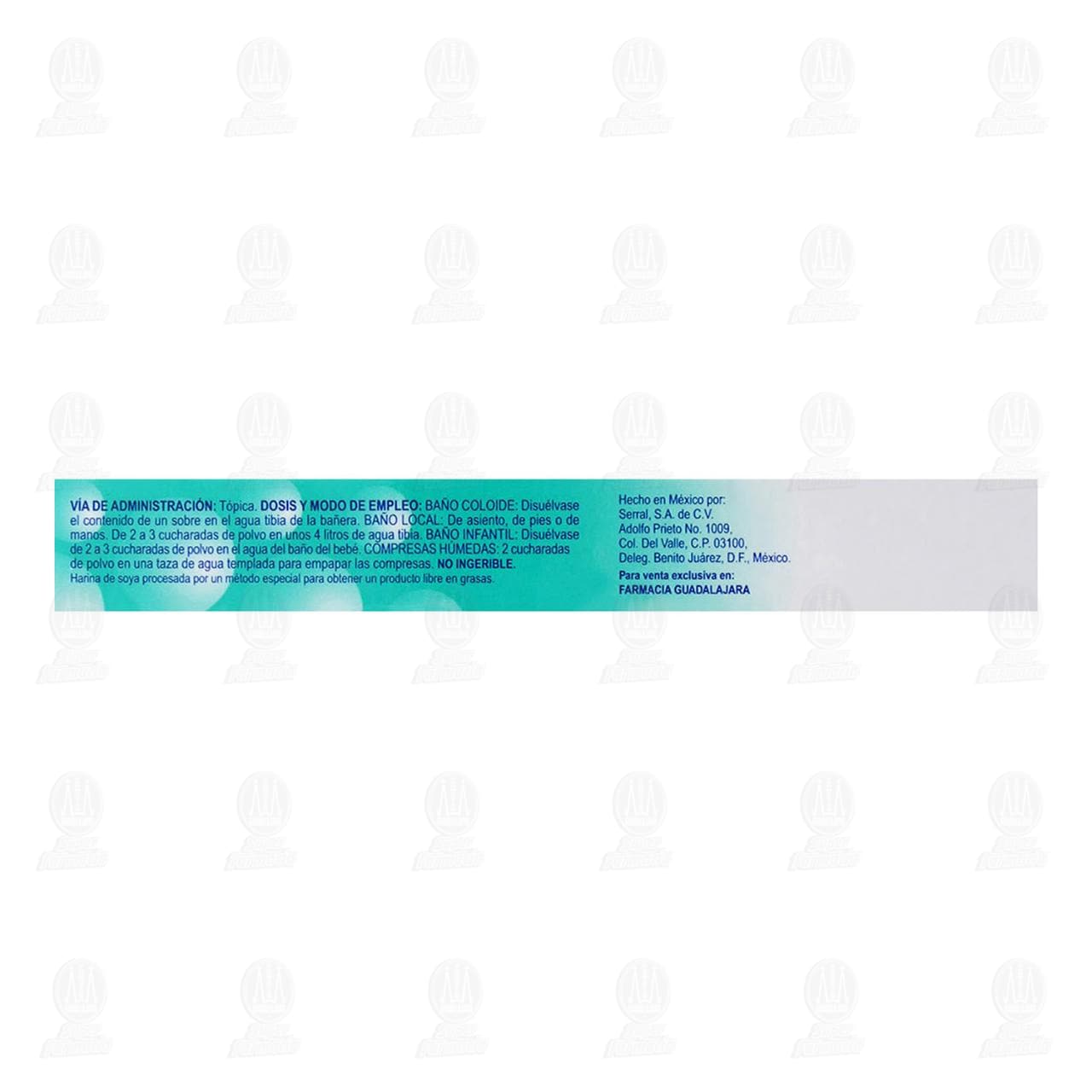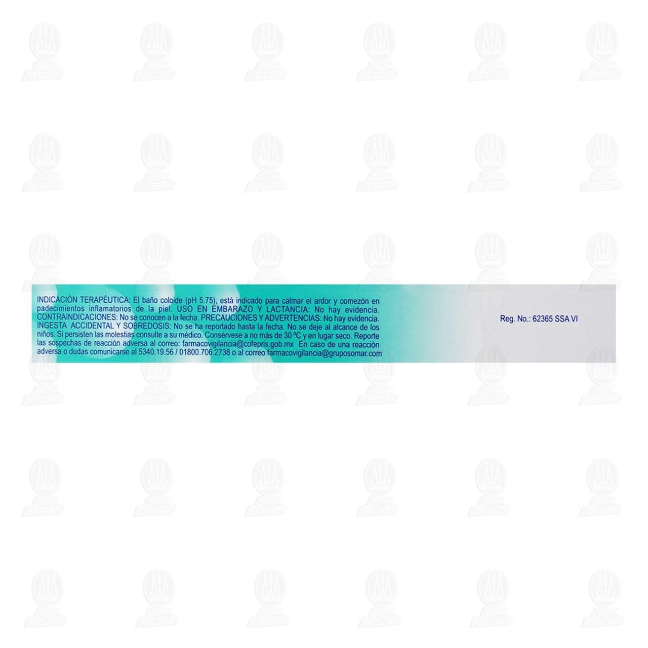 Vía de administración: tópica. Indicación terapéutica: el baño coloide (ph 5.75) está indicado para calmar el ardor y comezón padecimientos inflamatorios de la piel. Uso en embarazo y lactancia: no hay evidencia. Dosis y modo de empleo: baño coloide: disuélvase el contenido de un sobre en el agua tibia de la bañera. Baño local: de asiento, de pies o de manos. de 2 a 3 cucharadas de polvo en unos 4 litros de agua tibia. Baño infantil: disuélvase de 2 a 3 cucharadas de polvo en el agua del baño del bebé. Compresas húmedas: 2 cucharadas de polvo en una taza de agua templada para empapar las compresas. No ingerible.Detalles del producto