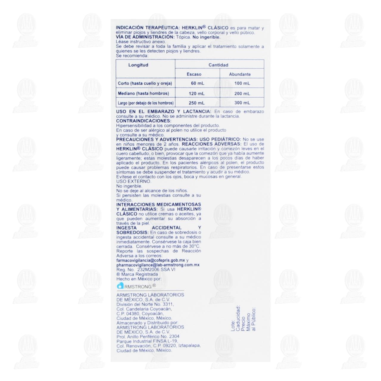 REACCIONES ADVERSAS: El uso de HERKLIN® CLÁSICO puede causarle irritación y comezón leves en el cuero cabelludo, o bien, provocar que la comezón que ya había aumente ligeramente; estas molestias desaparecen a los pocos días de haber aplicado el producto.