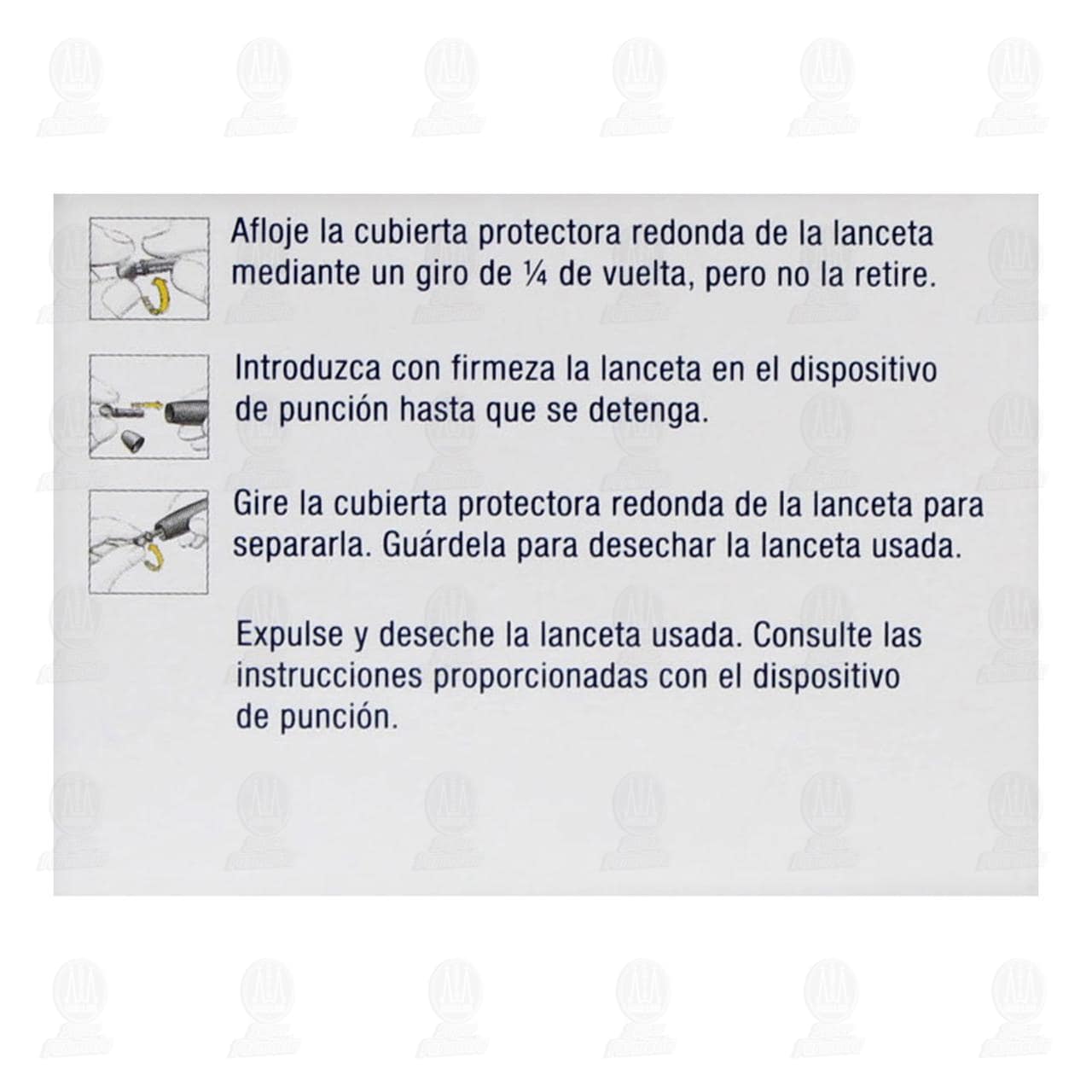 Introduzca con firmeza la lanceta en el dispositivo de punción hasta que se detenga. Gire la Cubierta protectora redonda de la lanceta para separarla. Guárdela para desechar la lanceta usada. Expulse deseche la lanceta usada. Consulte las instrucciones proporcionadas con el dispositivo de punción.Detalles del producto