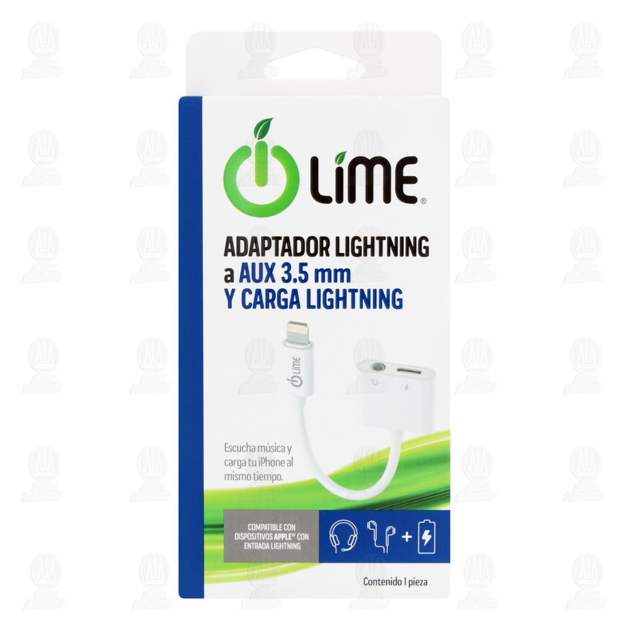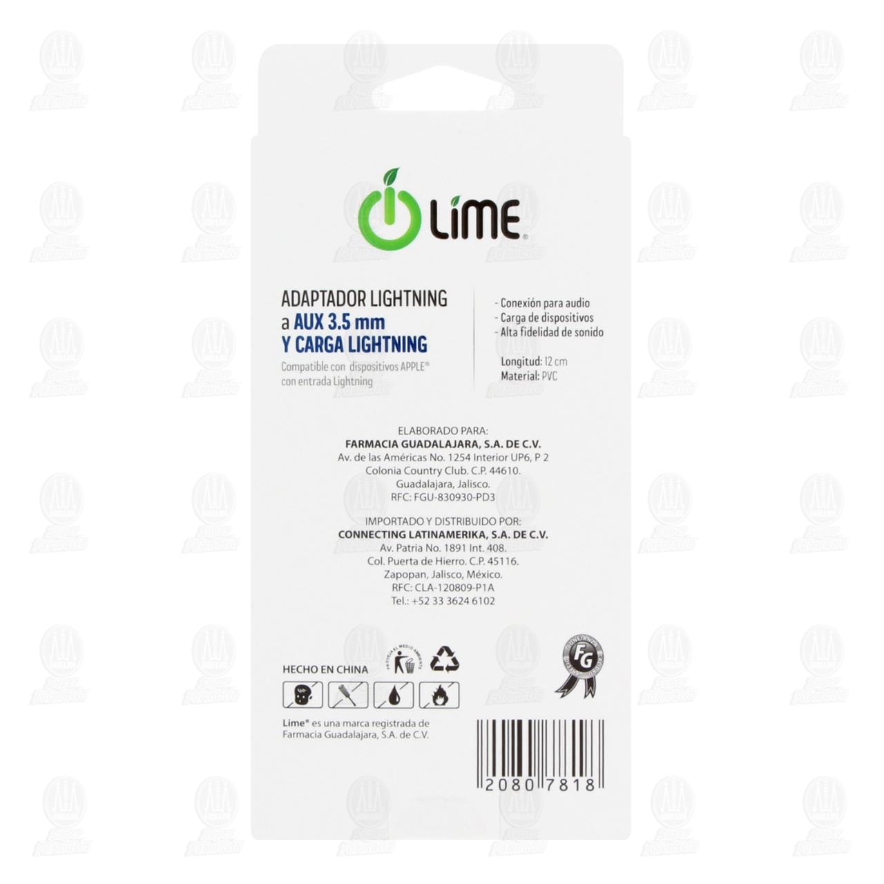 Adaptador Lime Lightning a AUX 3.5 mm y Carga Lightning, 1 pz.
