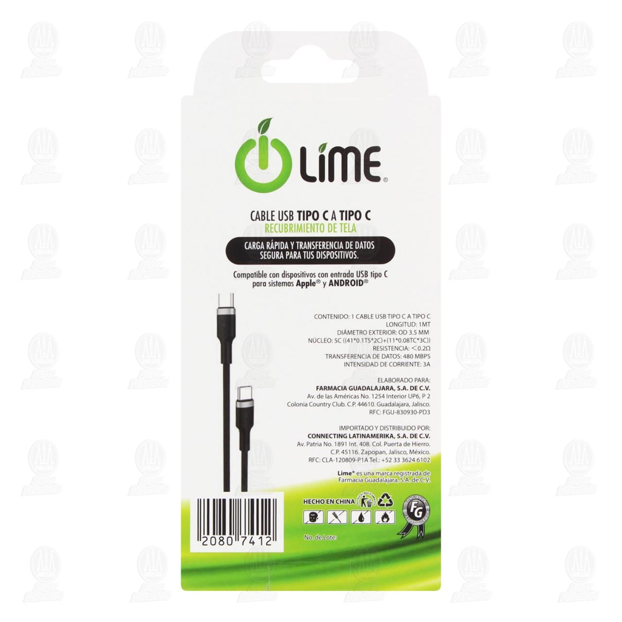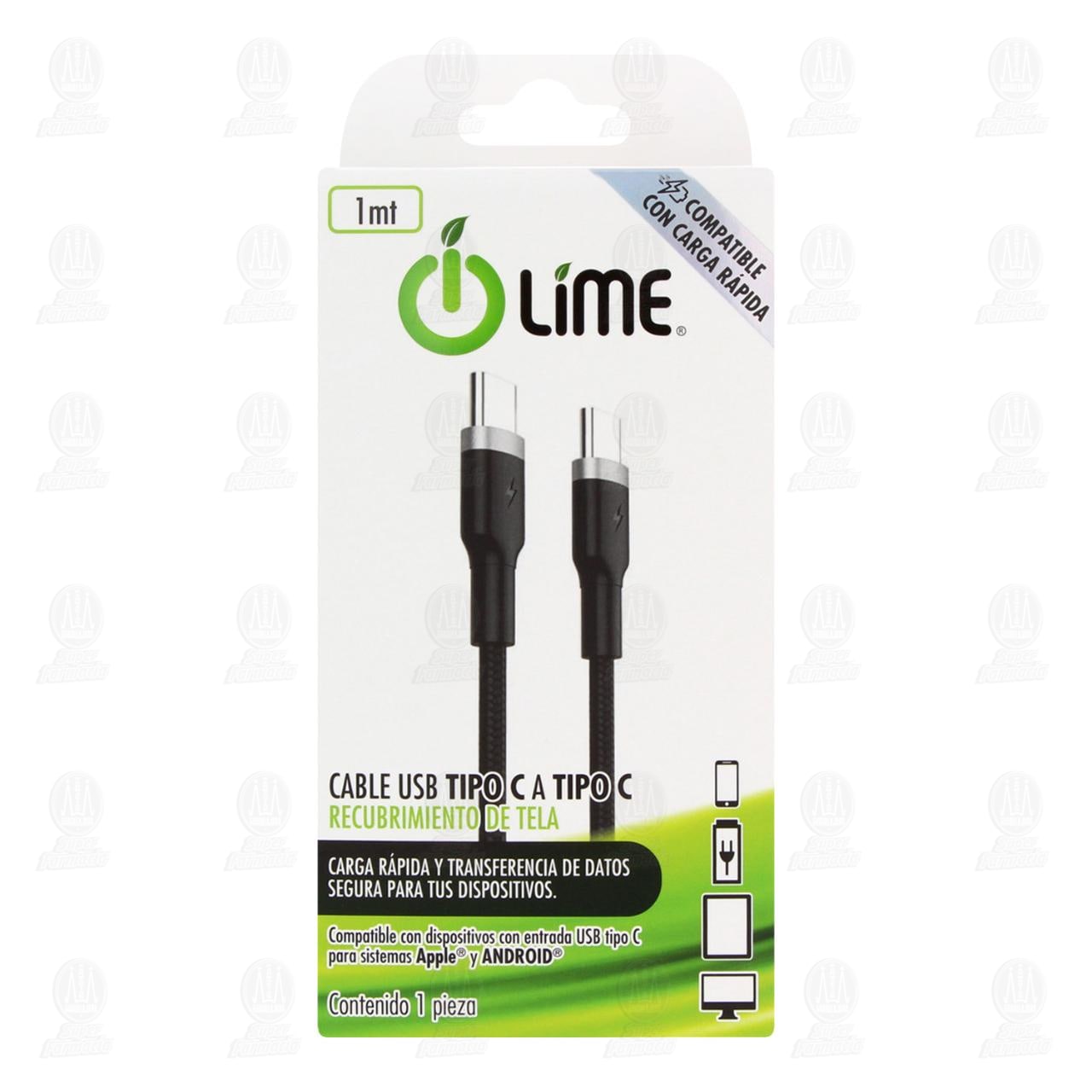 Accesorio telefónico Lime, Cable USB Tipo C a Tipo C de 1 metro con Recubrimiento de tela, para Sistemas Apple y Android. Contiene 1 pieza.