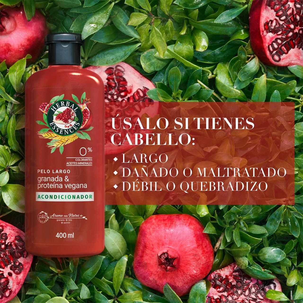Acondicionador Herbal Essences Pelo Largo Granada y Proteína Vegana, 400 ml.