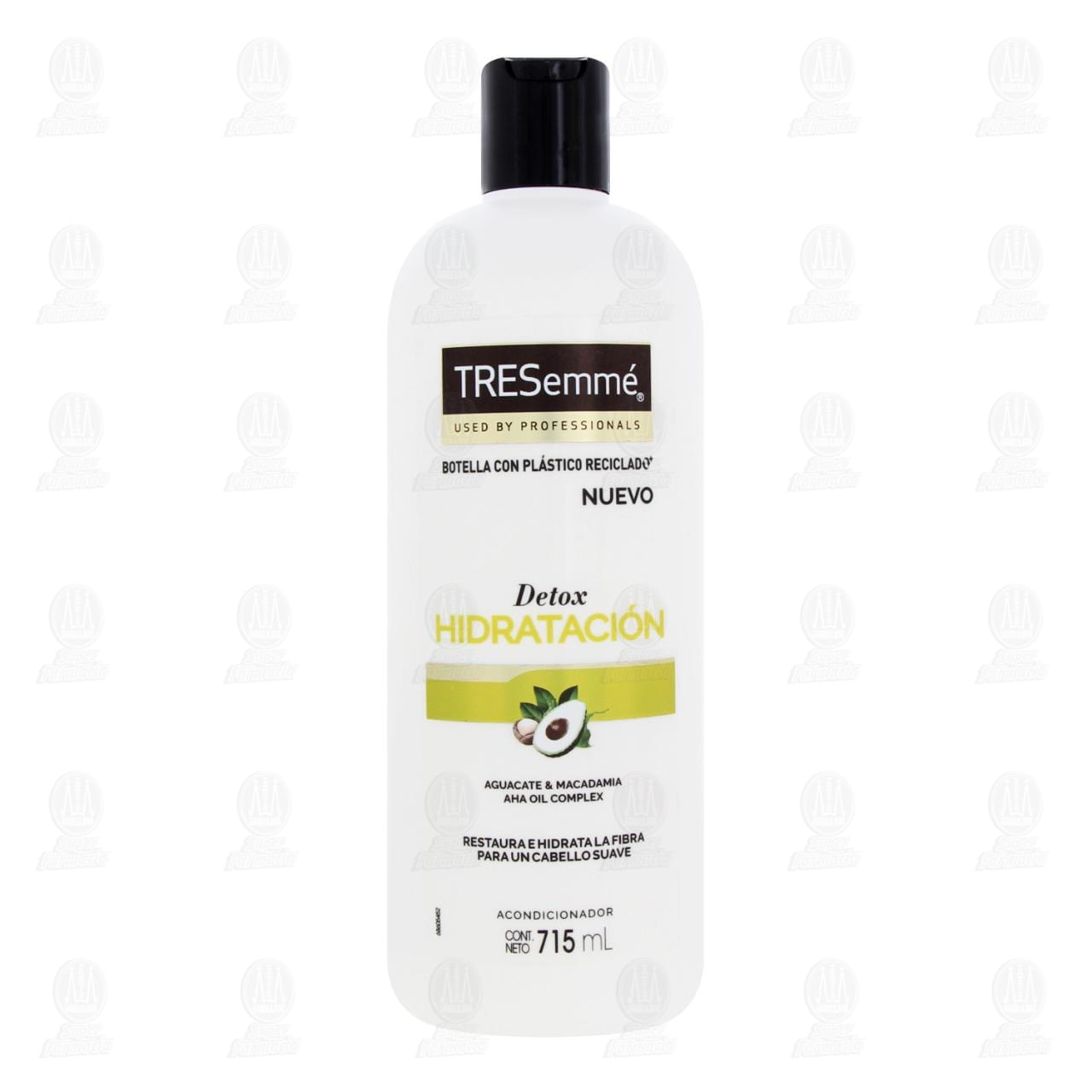 Acondicionador Tresemmé Detox Hidratación, con aguacate y macadamia, restaura la fibra y equilibra la hidratación y brillo del cabello graso, fórmula con Aha Oil Complex. Envase con 715 mililitros.