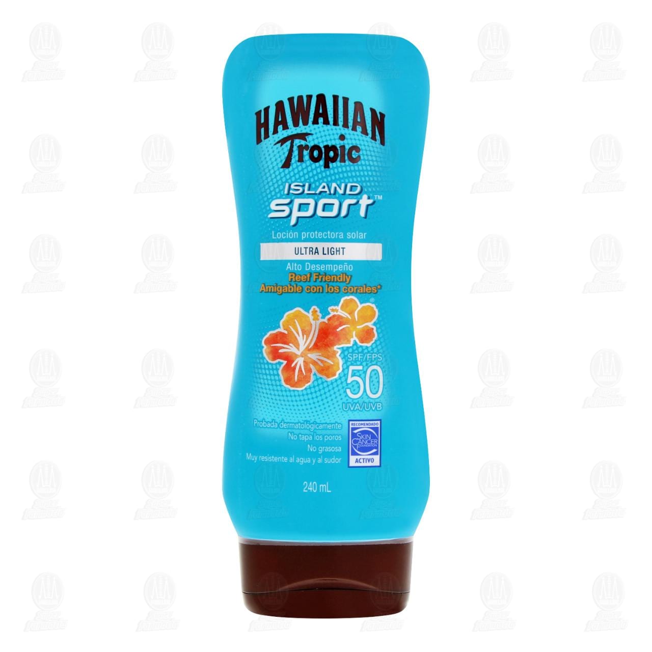 Protector Solar Hawaiian Island Sport ultra light en loción FPS 50 de alto desempeño, Ayuda a prevenir las quemaduras solares. Contiene 240 mililitros.