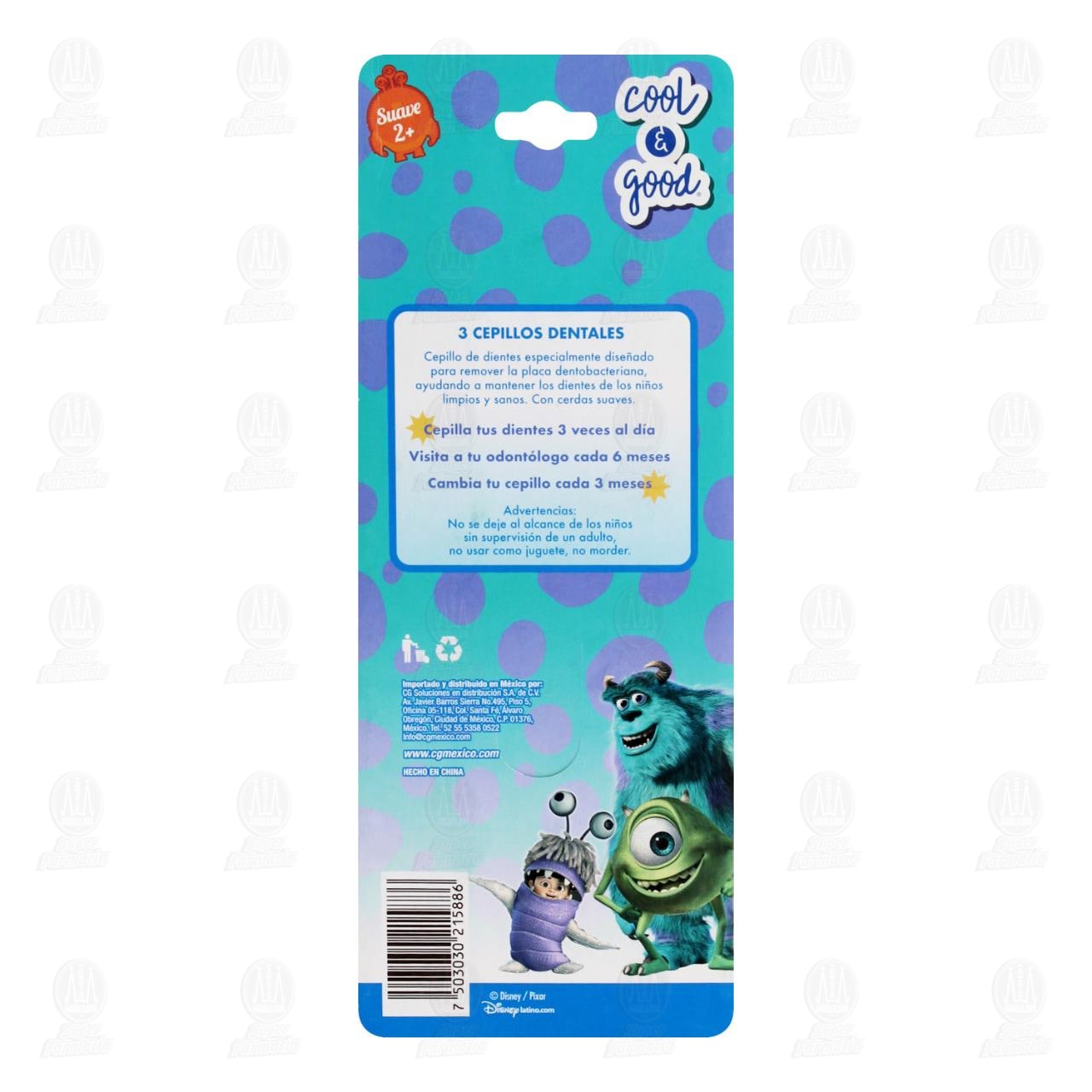 Cepillo dental Cool & Good con cerdas suaves, edición Disney Pixar Monsters Inc, especialmente diseñado para remover la placa dentobacteriana, ayudando a mantener los dientes de los niños limpios y sanos. Contiene 3 piezas.
