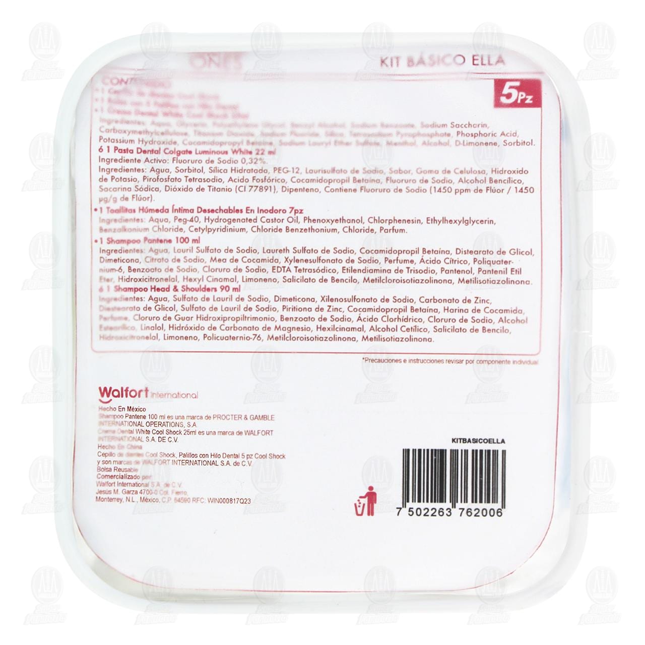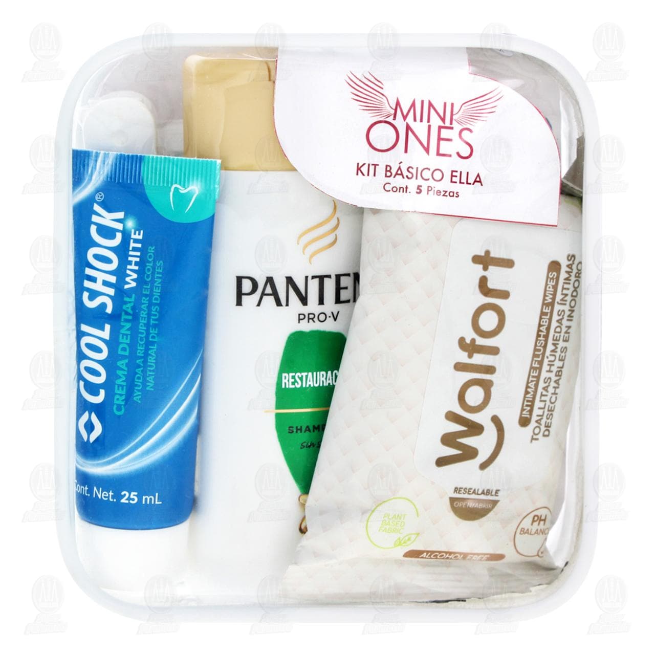 Kit Básico Ella Mini Ones. Contiene 5 piezas: 1 Cepillo de dientes + 5 Palillos con Hilo Dental + 1 Crema Dental White Cool Shock de 25 mililitros + 1 Paquete de Toallitas Húmedas Íntimas con 7 Piezas y 1 Shampoo Pantene de 100 mililitros.