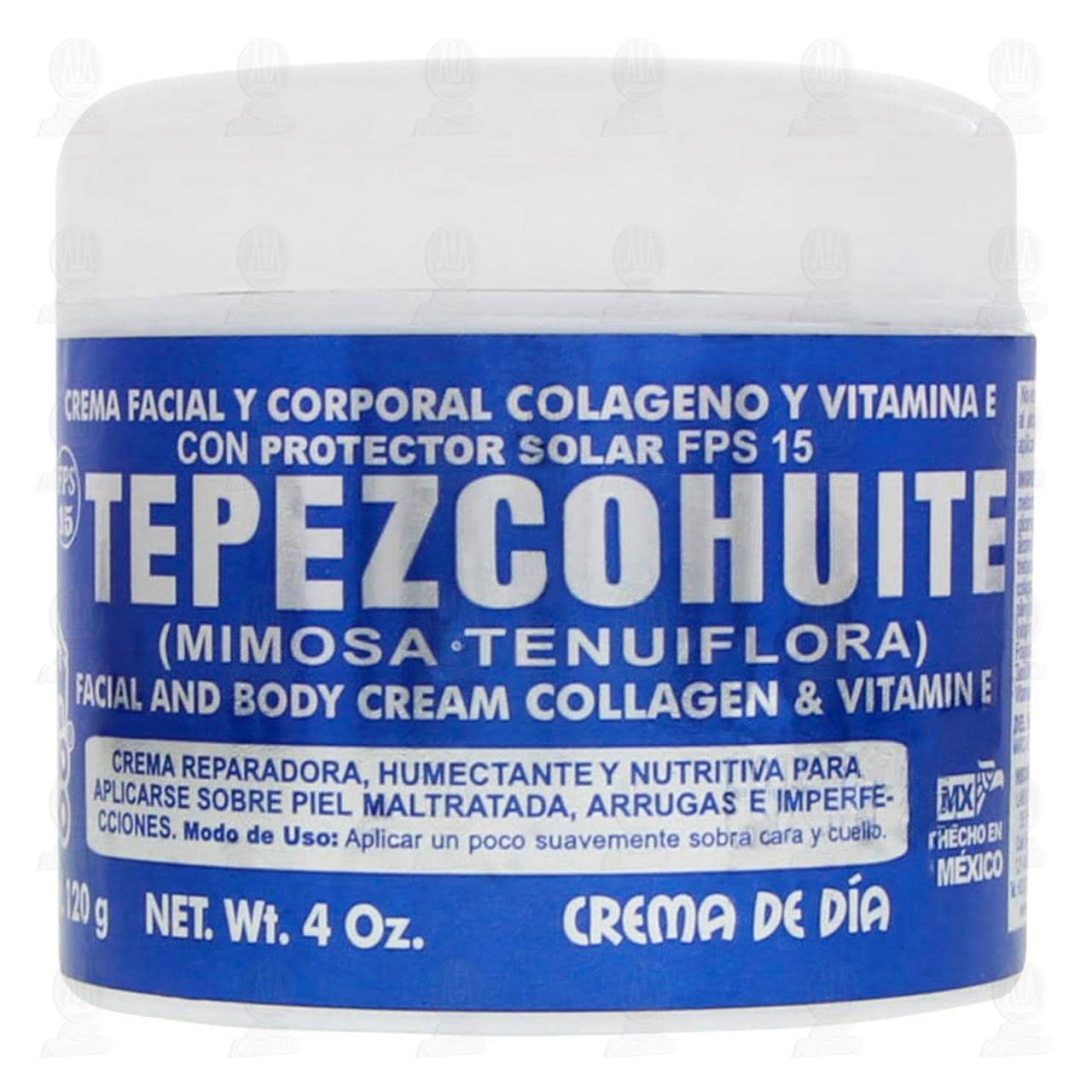 Crema corporal y facial Del Indio Papago de Tepezcohuite, con colágeno y vitamina E reparadora, humectante y nutritiva para piel maltratada, arrugas e imperfecciones, tiene protector solar FPS 15 para el dia. Envase con 120 gramos.