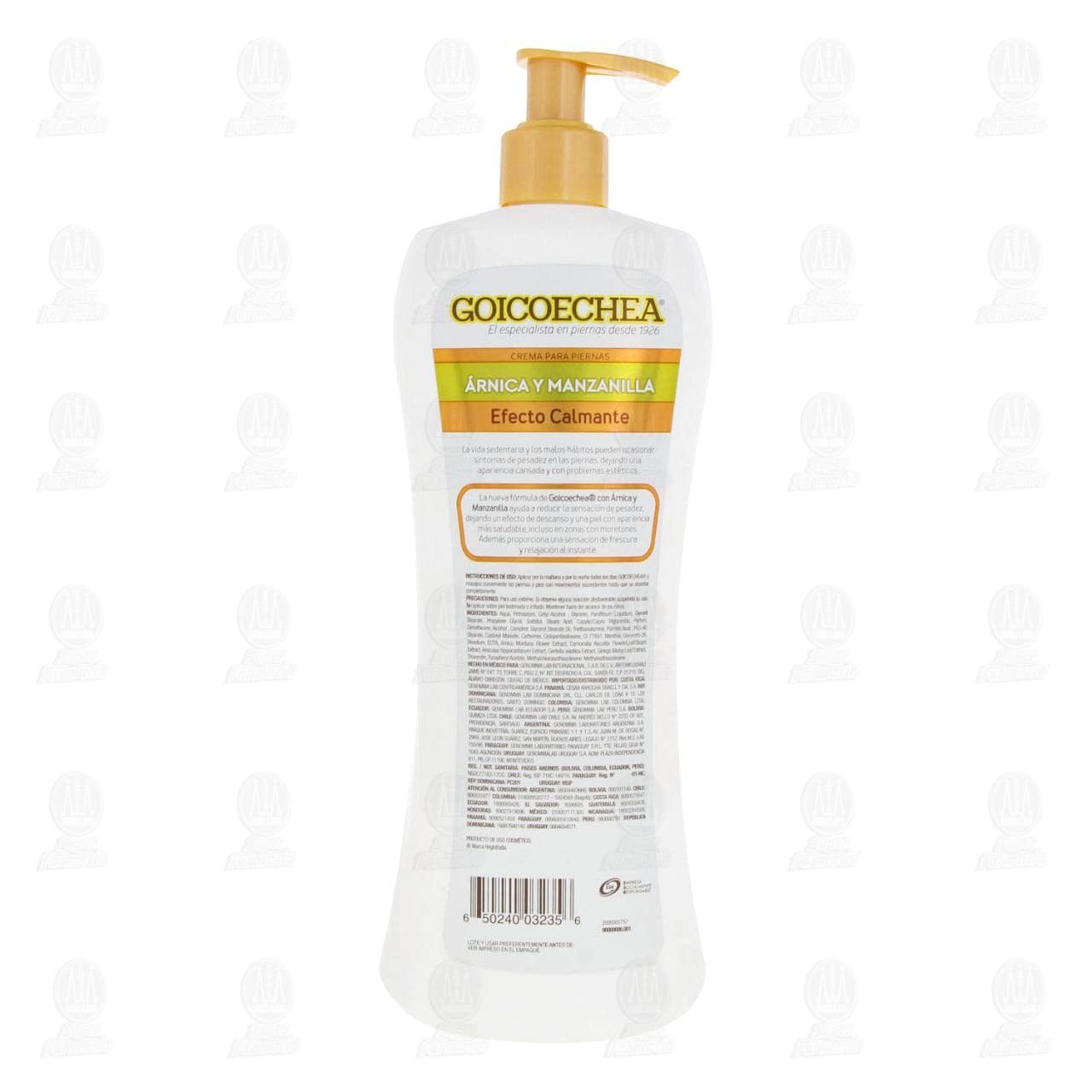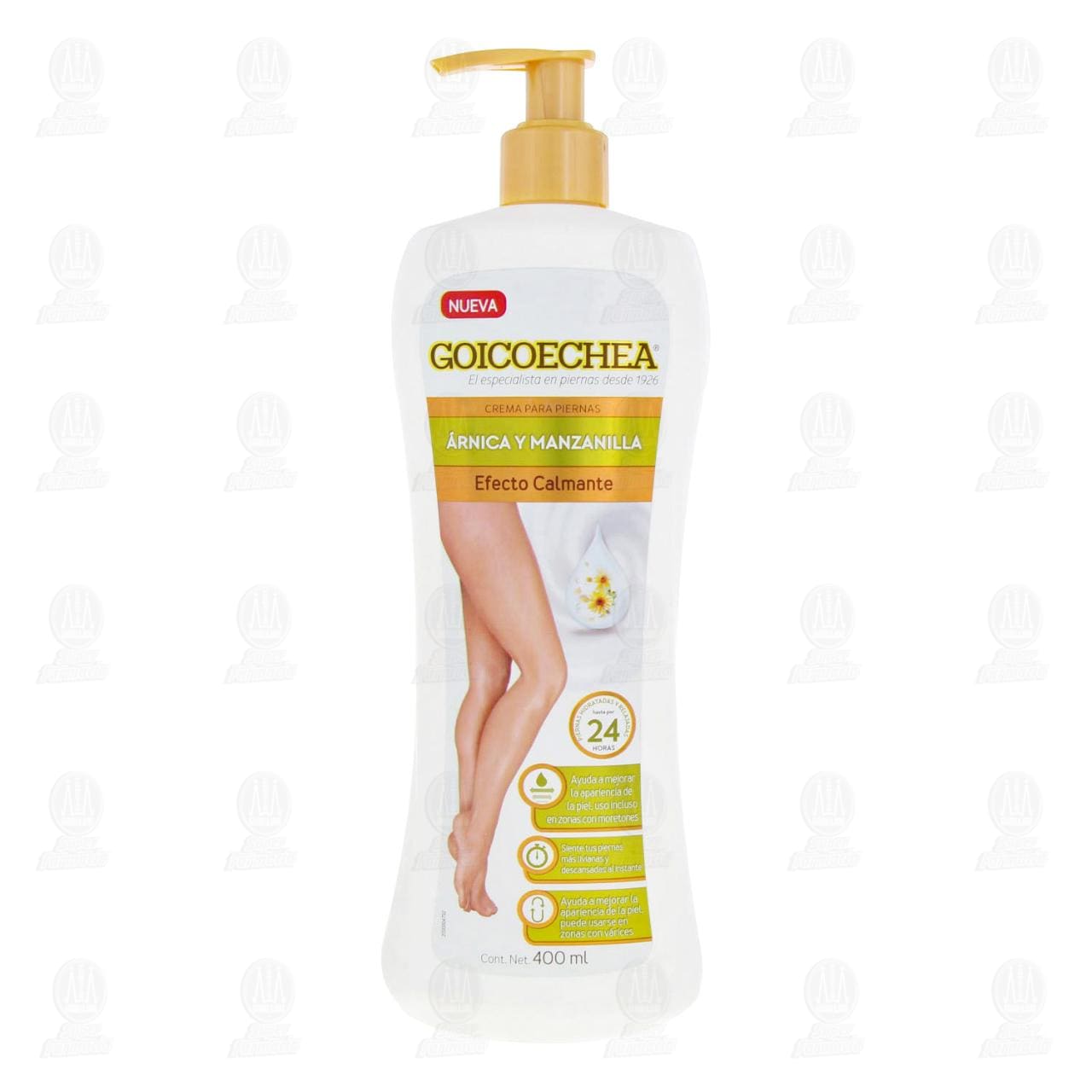 Crema para piernas Goicoechea efecto calmante con árnica y manzanilla, ayuda a mejorar la apariencia de la piel, incluso en zonas con moretones. Envase con 400 mililitros.
