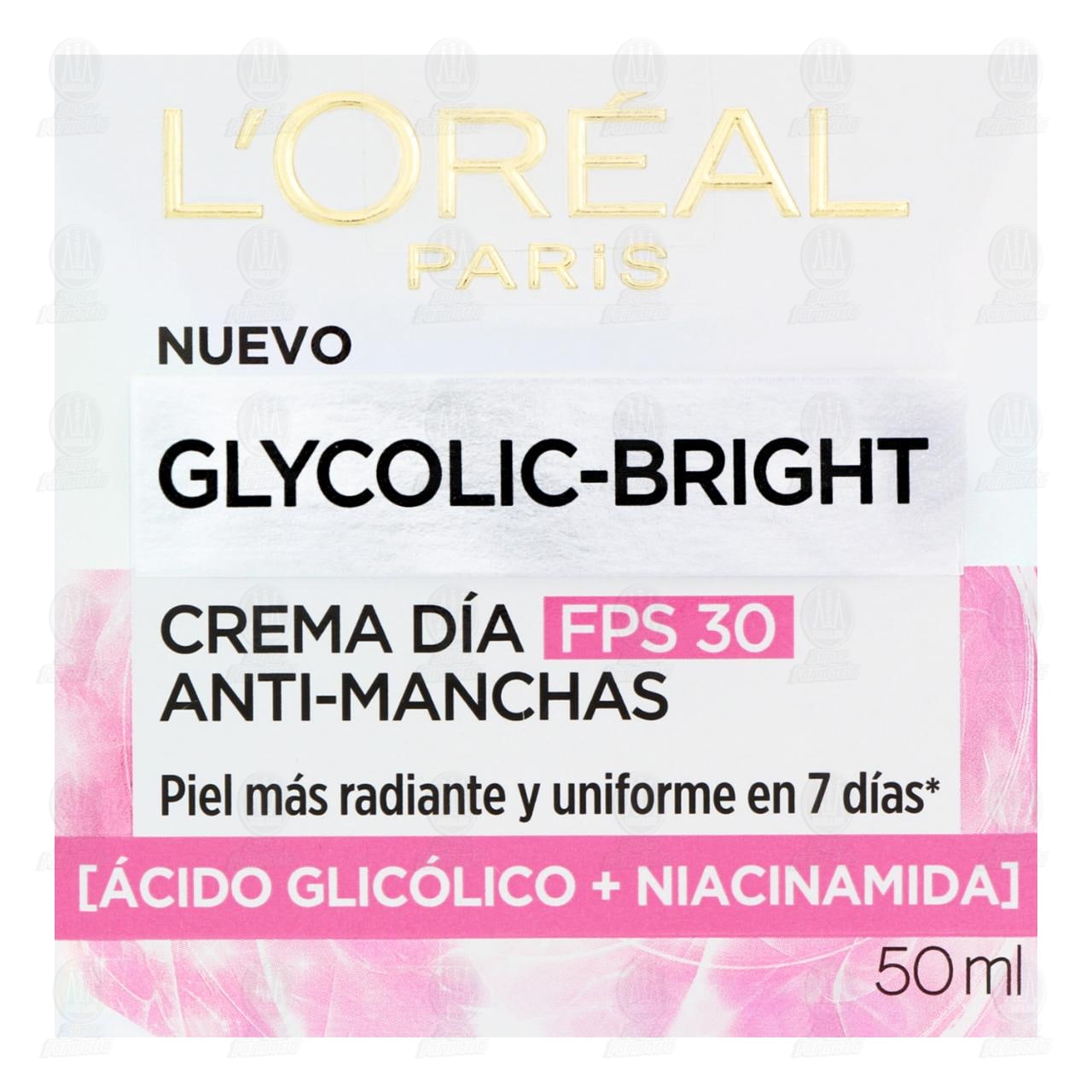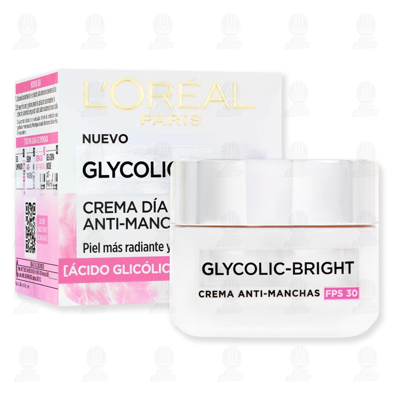 Crema Facial L'Oréal Paris Glycolic-Bright FPS 30 Anti-Manchas Piel más Radiante y Uniforme en 7 Días, Uso de Día. Contiene 50 mililitros.
