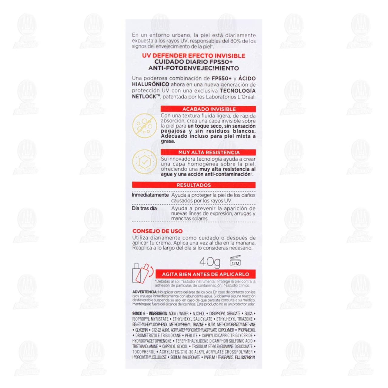 Crema facial L'Oréal Paris UV Defender Fluido Invisible, cuidado diario y anti-fotoenvejecimiento, FPS 50+ UVA UVB, textura fluida, ligera y de rápida absorción que crea una capa invisible sobre la piel para un toque seco. Contiene 40 gramos.