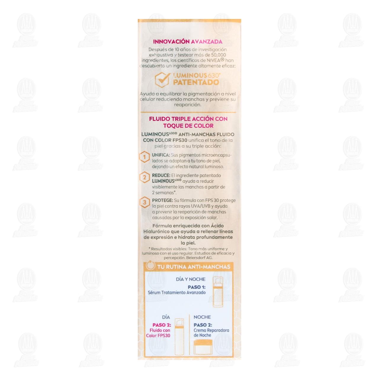 Nivea Luminous 630° Anti-Manchas Fluido con Color FPS30 3 en 1 Tono Medio. Ayuda a Equilibrar la Pigmentación a Nivel Celular Reduciendo Manchas y Previene su Reaparición. Contiene 40 mililitros.