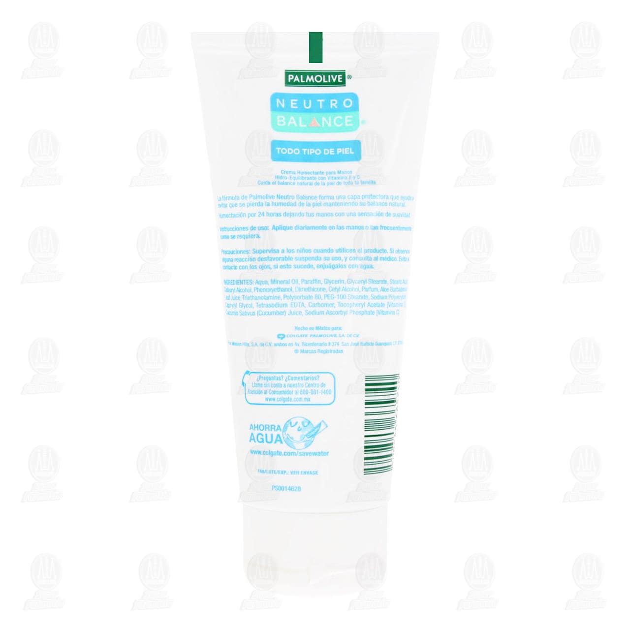 Crema humectante Palmolive Neutro Balance para manos de todo tipo de piel, su fórmula crea una capa protectora que ayuda a evitar que se pierda la humedad de la piel manteniendo su balance natural. Envase con 100 mililitros.