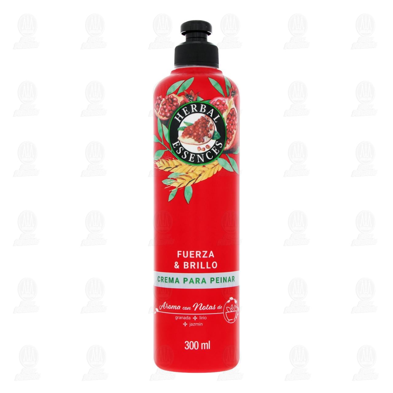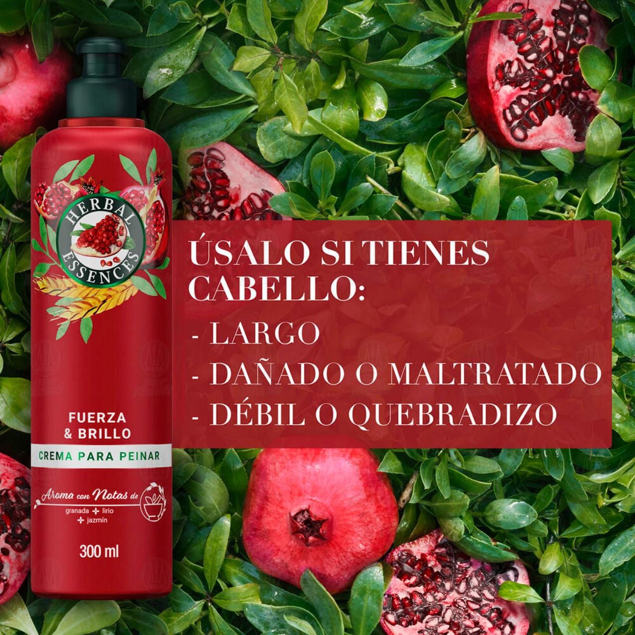 Crema para Peinar Herbal Essences Fuerza & Brillo aroma con notas de granada, lirio y jazmín. Envase con 300 mililitros.