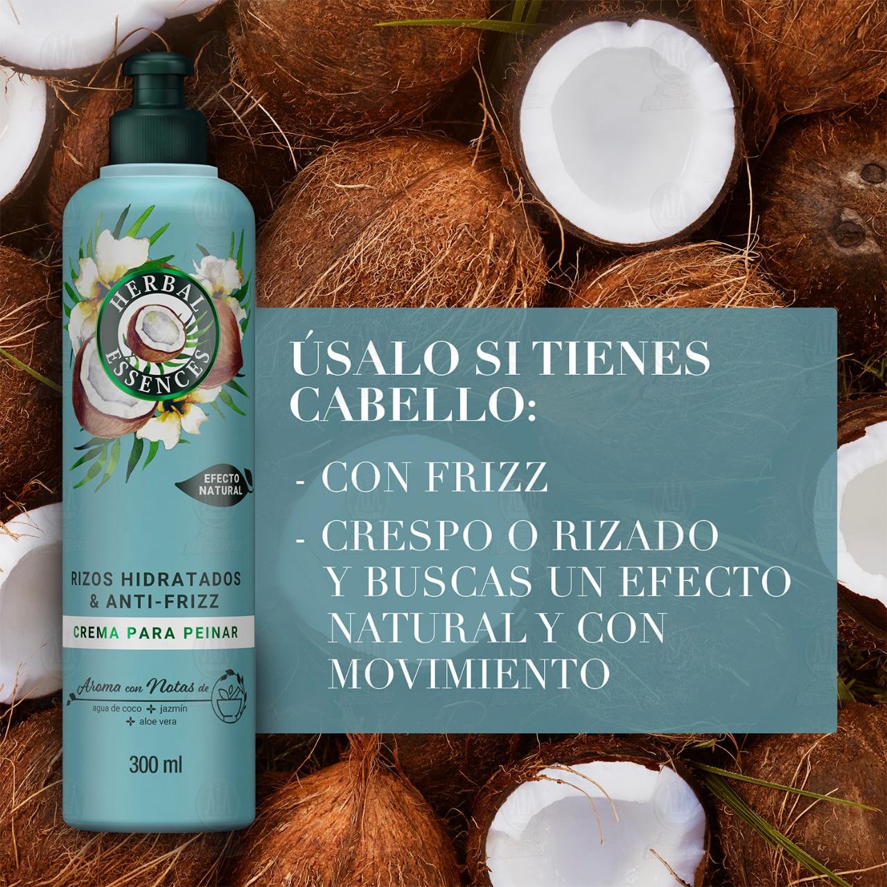 Crema para Peinar Herbal Essences Rizos Hidratados & Anti-Frizz, Aroma con notas de agua de coco, jazmín y aloe vera. Envase con 300 ml.