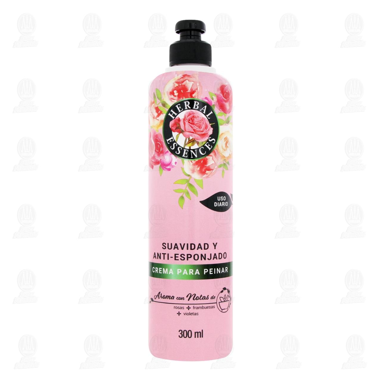 Crema para Peinar Herbal Essences Suavidad y Anti-Esponjado para uso diario, Aroma con notas de rosas + frambuesas + violetas. Envase con 300 mililitros.