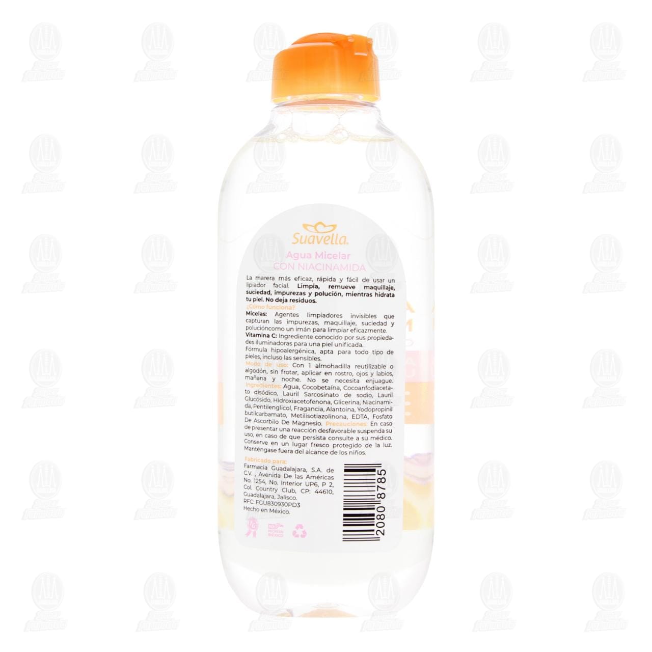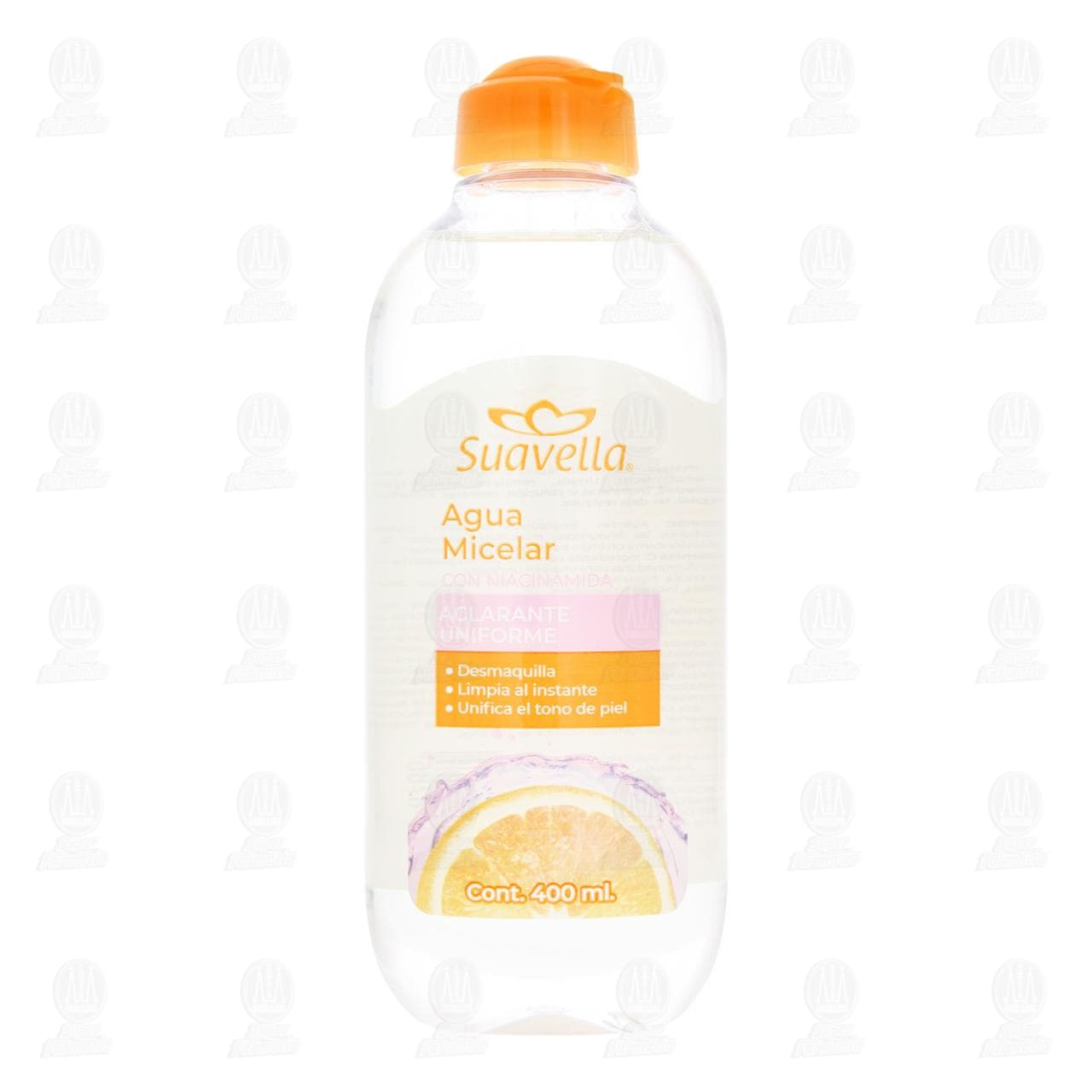 Agua Micelar con Niacinamida Suavella Aclarante Uniforme, Limpia, remueve maquillaje, suciedad, impurezas y polución, Mientras hidrata tu piel. Envase con 400 mililitros.