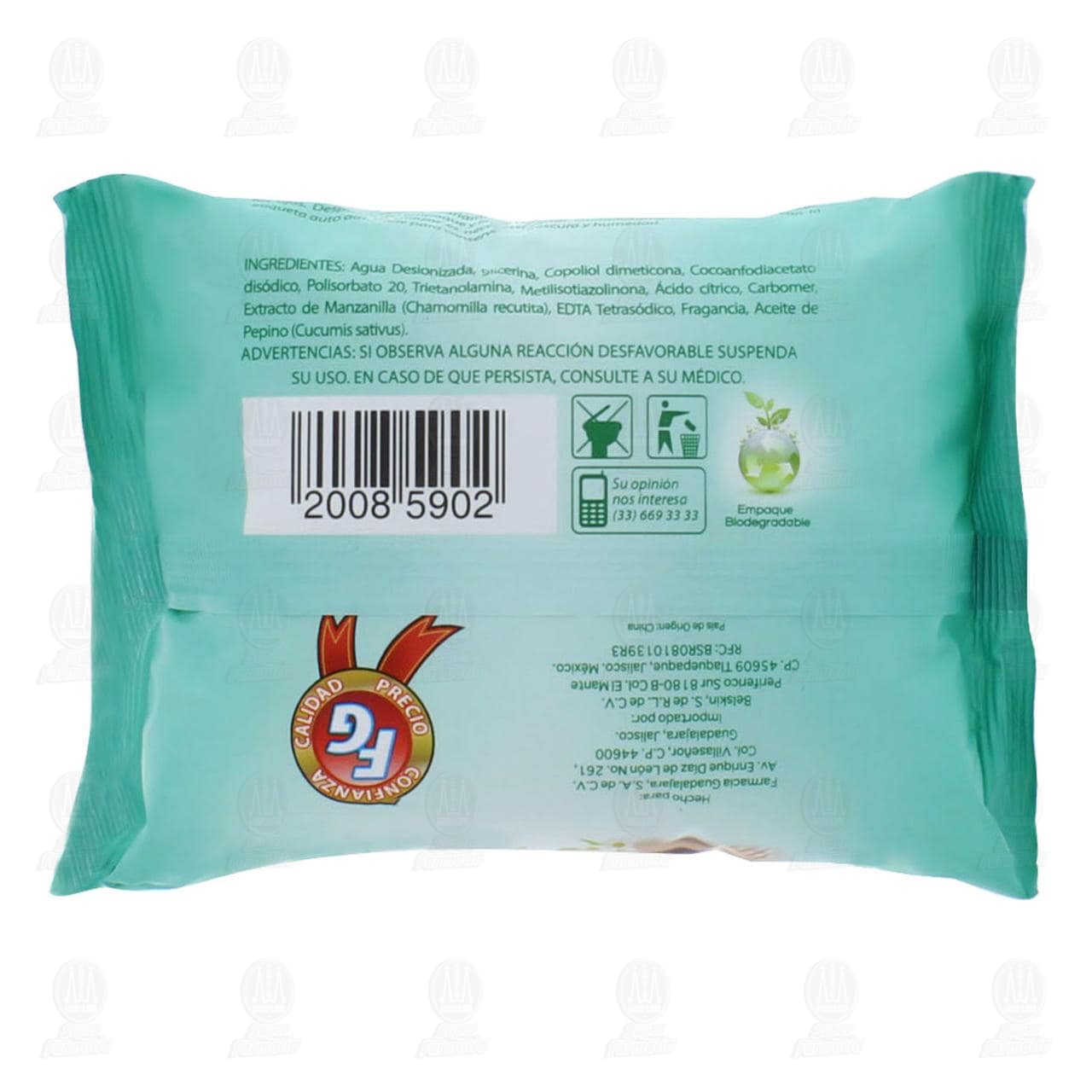 Toallitas desmaquillantes Suavella con manzanilla y pepino, limpian, refrescan y suavizan la piel. Paquete con 25 piezas.