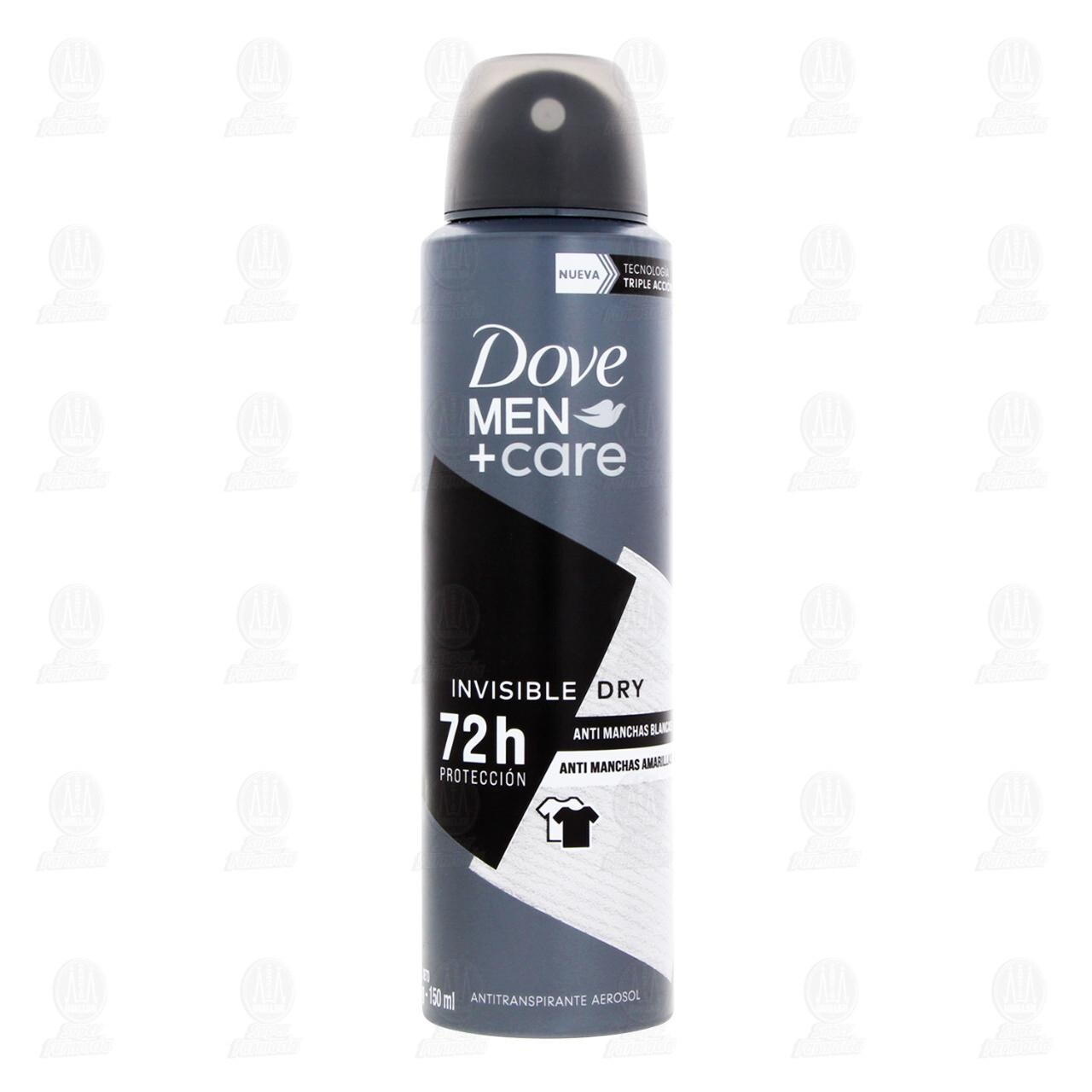 Antitranspirante Dove Men +Care Invisible Dry en Aerosol Anti Manchas Blancas y Anti Manchas Amarillas, 72h de Protección con 1/4 de Crema Humectante. Envase con 150 mililitros.