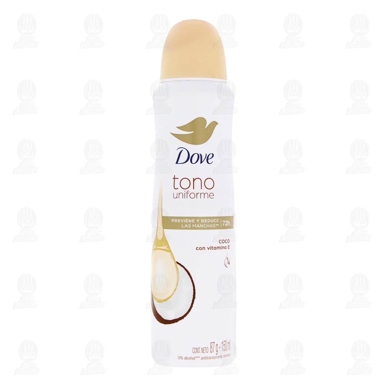 Antitranspirante Dove Tono Uniforme Coco con Vitamina E, Previene y Reduce las Manchas 72h en Aerosol. Envase con 150 mililitros.