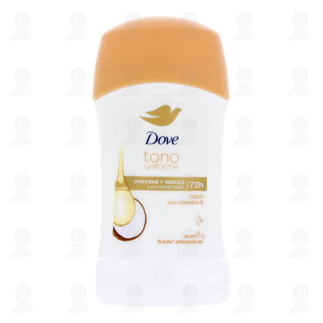 Antitranspirante Dove Tono Uniforme Coco con Vitamina E, Previene y Reduce las Manchas 72h en Barra. Envase con 45 gramos.