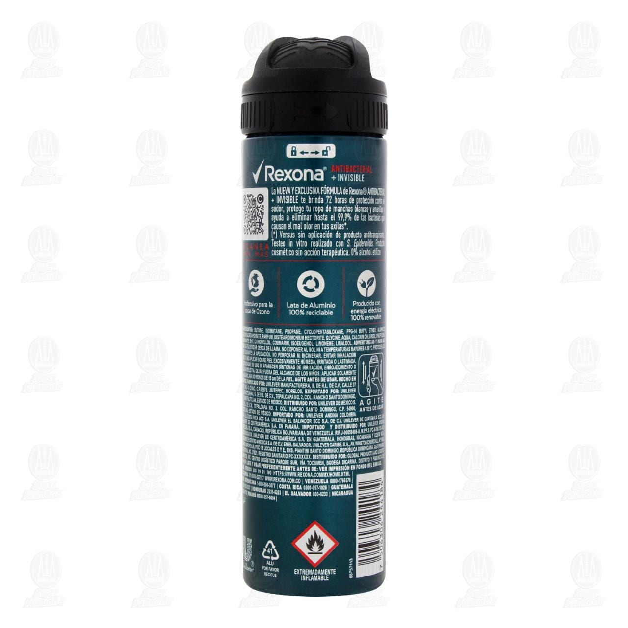 Antitranspirante Rexona Antibacterial + Invisible en aerosol, brinda 72 horas de protección, protege tu ropa de manchas blancas y amarillas y elimina hasta el 99.9% de las bacterias que causan el mal olor. Envase con 150 mililitros.