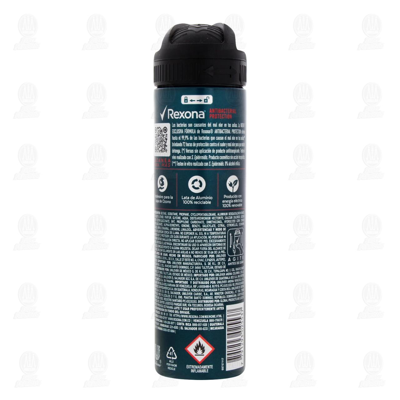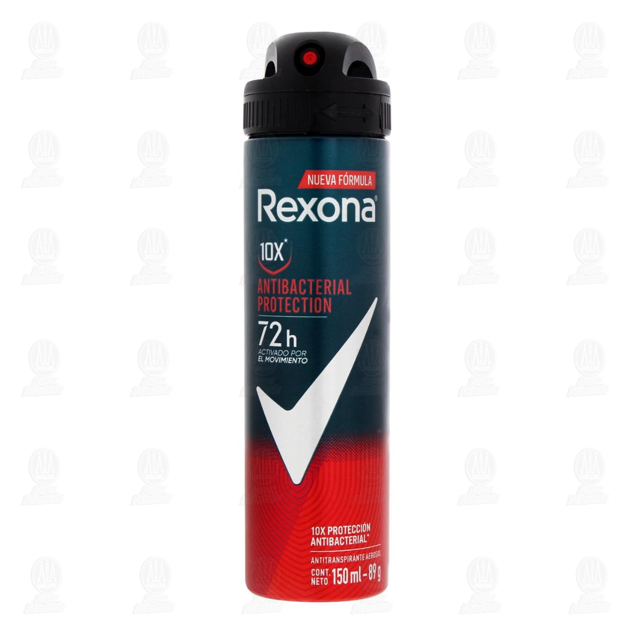 Antitranspirante Rexona Antibacterial Protection en aerosol, elimina hasta el 99.9% de las bacterias que causan el mal olor en tus axilas, brindando 72 horas de protección contra el sudor y mal olor. Envase con 150 mililitros.