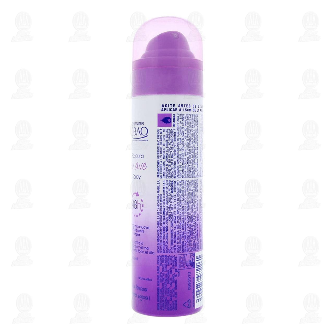 Desodorante y antitranspirante Garnier Obao frescura suave en aerosol para mujer, con aroma perdurable que no irrita la piel y te protege hasta por 48 horas. Envase con 150 mililitros.
