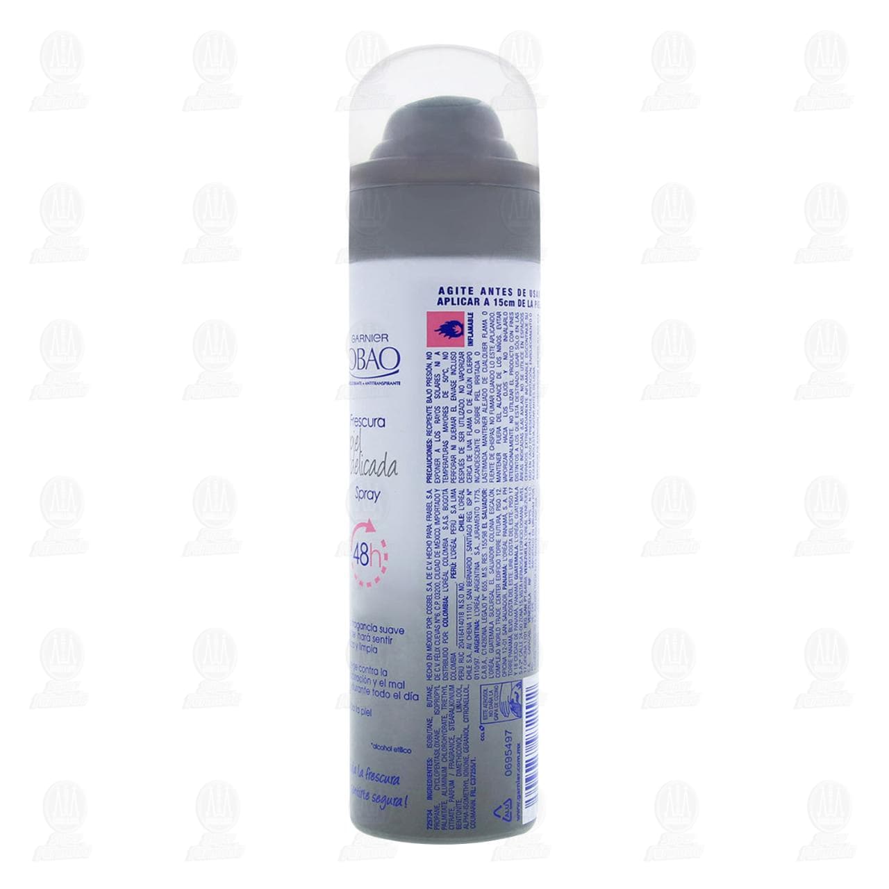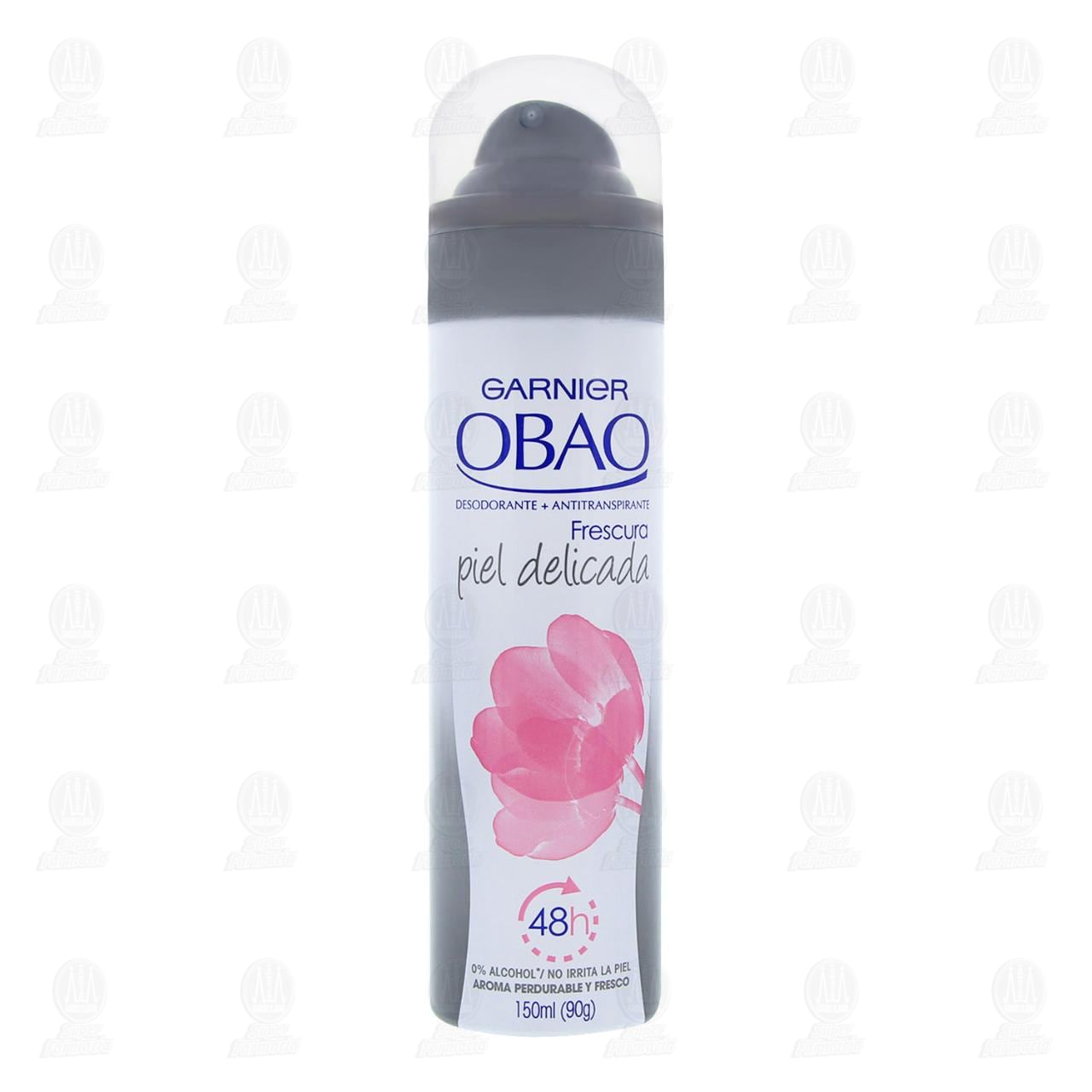 Antitranspirante y desodorante Garnier Obao frescura piel delicada en aerosol para mujer, no irrita y tiene un aroma perdurable y fresco con 48 horas de protección. Envase con 150 mililitros.