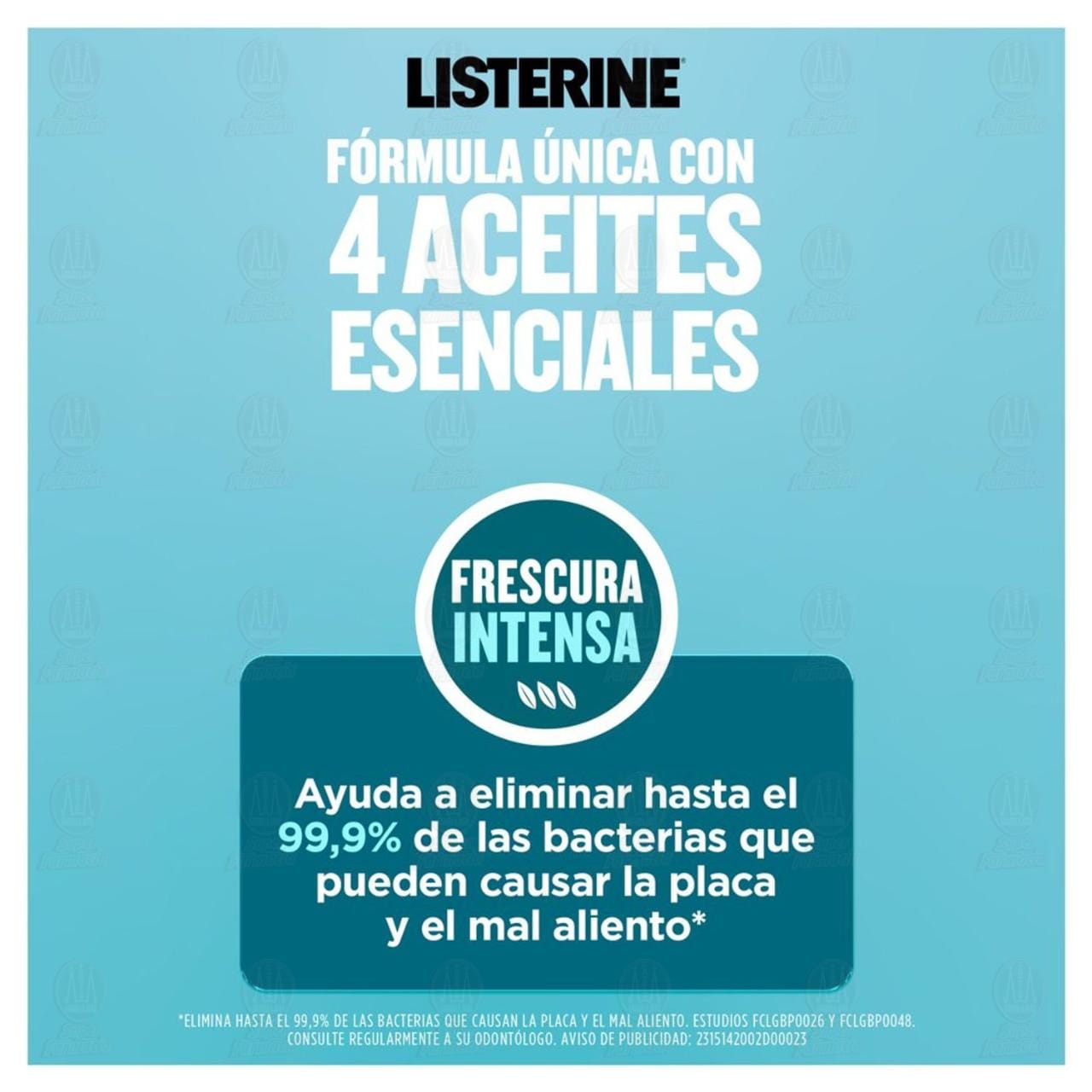 Enjuague Bucal Listerine Cool Mint Frescura Intensa elimina hasta el 99% de los gérmenes que causan la placa, caries y mal aliento. Úsalo en la mañana y en la noche para un aliento fresco y una boca más saludable por 24 horas.